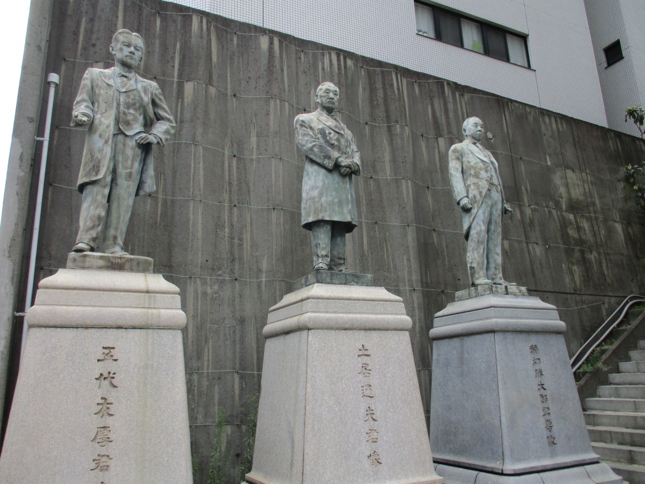 松屋町筋ぞいにある大阪商工会議所の横に、三人の会頭の大きな銅像が立っています。手前より五代友厚(初代)、土居通夫(七代)、稲畑勝太郎(十代)です。