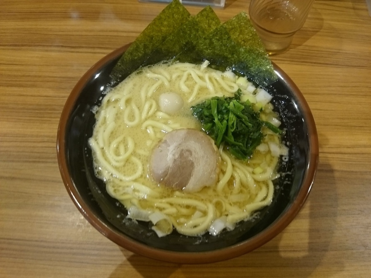 東京メトロ東西線西葛西駅真下の商業施設・西葛西メトロセンターにある横浜家系のラーメン屋さんです。ランチで醤油ラーメンをいただきました。具は家系ラーメン定番の海苔3枚、ホウレンソウ、ウズラのゆで卵、チャーシュー、ネギで、自分で玉ねぎと生姜をトッピング。麺は極太縮れ麺で濃厚な豚骨醤油スープの一品です。食べ慣れた壱角家の醤油ラーメン。豚骨の旨みののあるスープで、何度食べても美味しいですね。