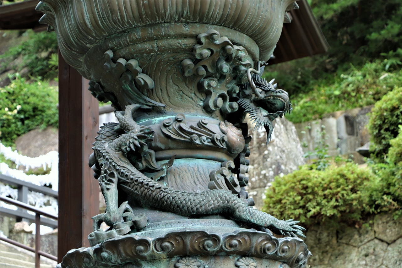 その奥の院の入口に、力強く花台を巻く龍神の姿を刻んだ青銅の灯籠があります。