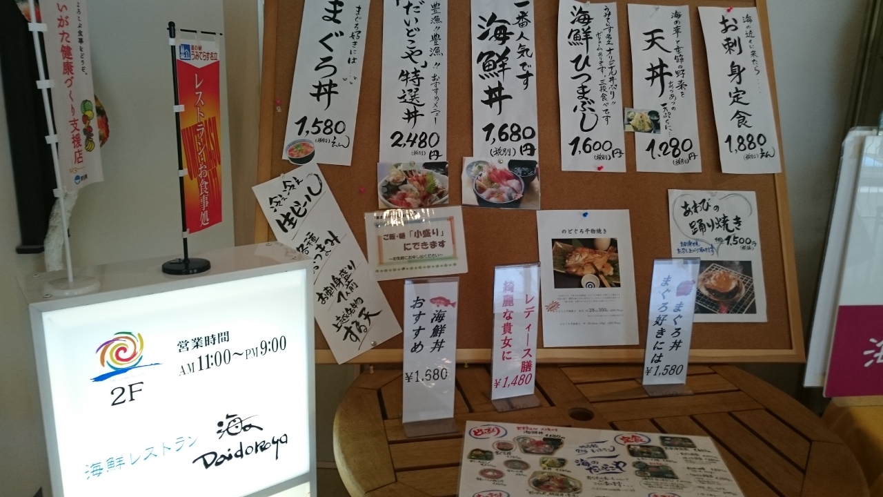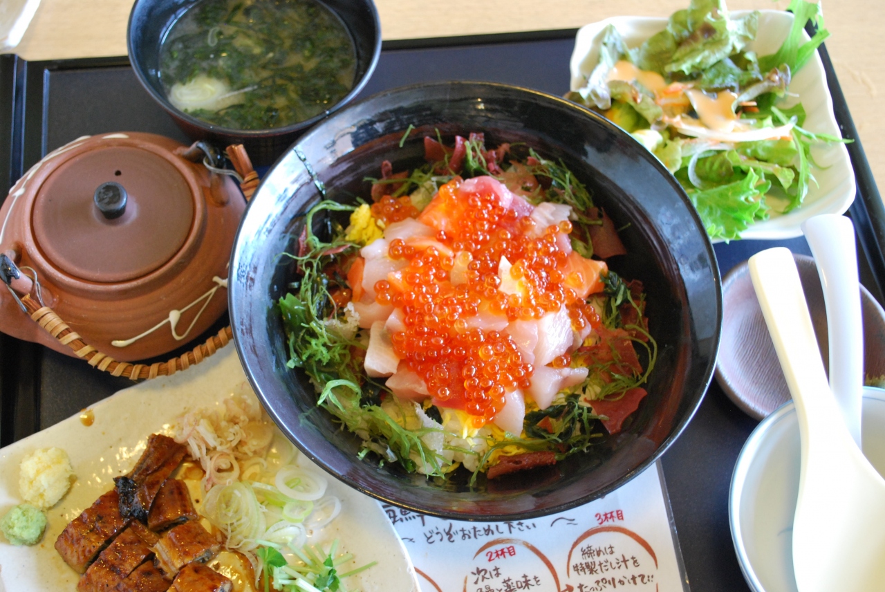 上越市の道の駅『うみてらす名立』2Fにあるレストランです。海鮮ひつまぶし¥1,600をいただきました。見た目も豪華でボリュームも満点。オススメの食べ方のシートもついていました。14時過ぎに入店したのですが15時~17時は休憩時間らしく、店員の方がおしゃべりをしながら早々に掃除を始めて落ち着かなかったです。