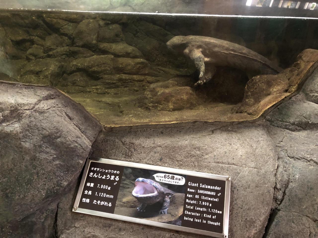 赤目四八滝に行くチケット売り場からすぐの建物に天然記念物のサンショウウオが水槽にたくさんいました。びっくりしたのはサンショウウオが長生きなこと。なかには60歳のものもいて大きくておどろきました。いろいろなサイズがいます。