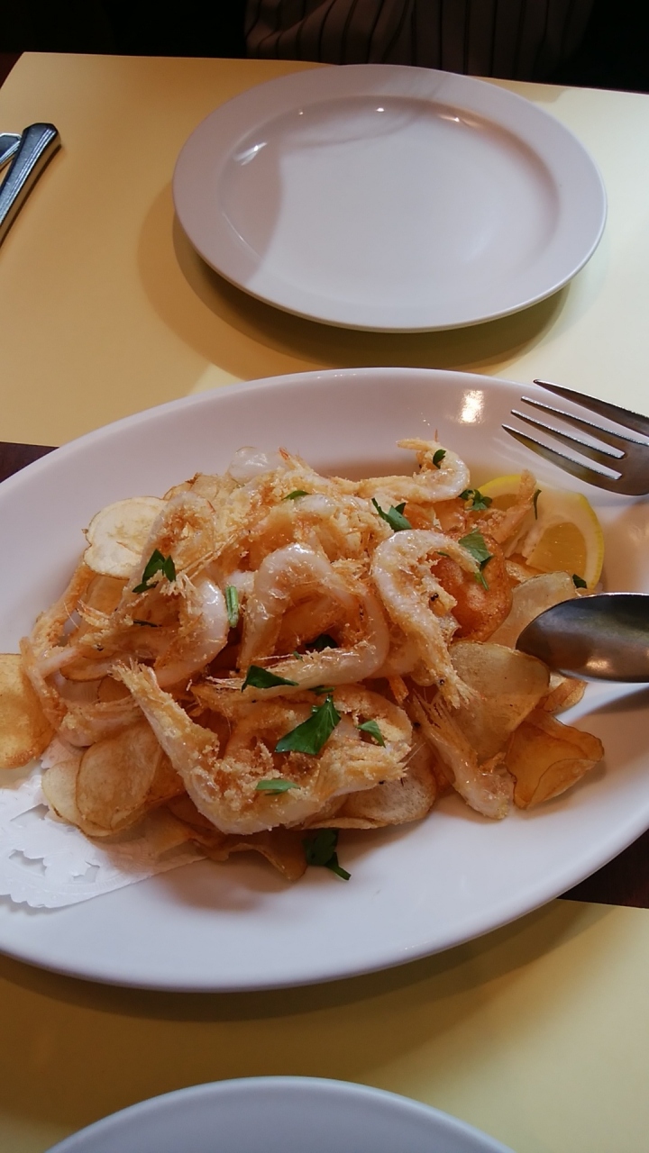 白エビのフリットは塩味がきいたお酒のおつまみにピッタリの前菜。薄焼きサクサクのピッツァ、アサリ出汁の利いたボンゴレともに満足でした。