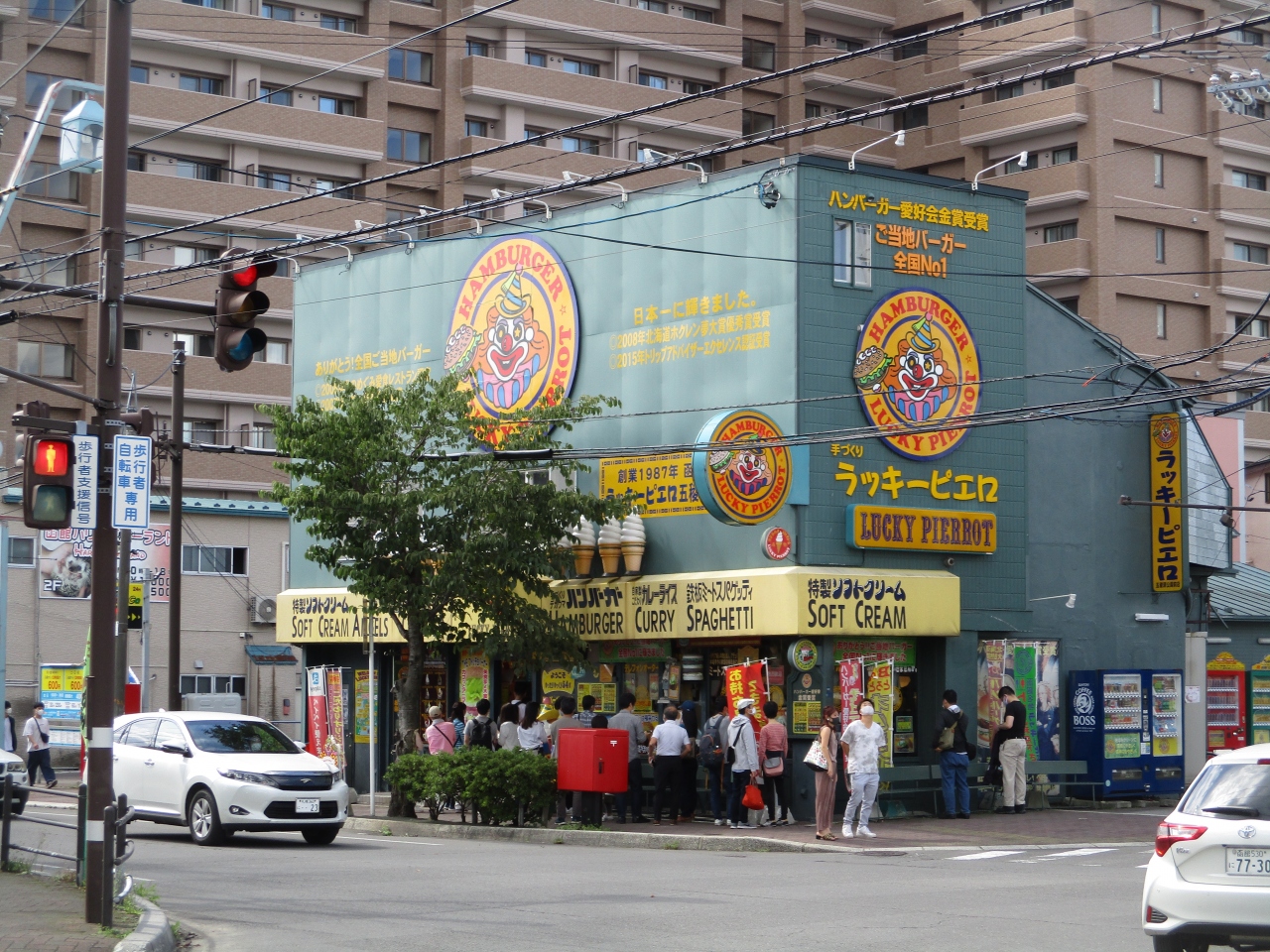 函館と言えばラッキーピエロです。観光地の五稜郭公園にもタワーの近くにありました。観光ついでに寄れるので、アクセスは便利だと思いますが、観光客がそのまま流れているのでお店の外に大行列ができていました。函館以外には出店しない方針なので、函館でしか食べることができないファーストフードなので人気店になっていました。