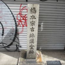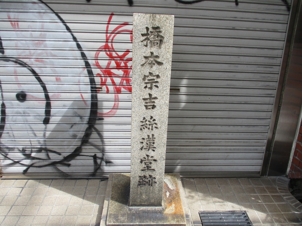 南船場の幼稚園向かいあたりに碑だけぽつんとあります。碑のうしろのシャッターが落書きされているのが悲しいかんじです。橋本宗吉(1763~1838)は江戸時代後期の蘭学者です。。傘の紋描きを家業としていましたが、幼い頃よりの抜群の記憶力を間重富と小石元俊(京都の医師)に見い出され、二人の援助により江戸の大槻玄沢のもとでオランダ語を学びました。4ヶ月間江戸に滞在後 大阪に戻り蘭学本の翻訳や開業医をしながら蘭学塾「絲漢堂(しかんどう)」を開設し、西洋科学の研究・教育につとめました。彼はまたエレキテルの科学的実験も行い、日本の電気学の祖とも呼ばれています。