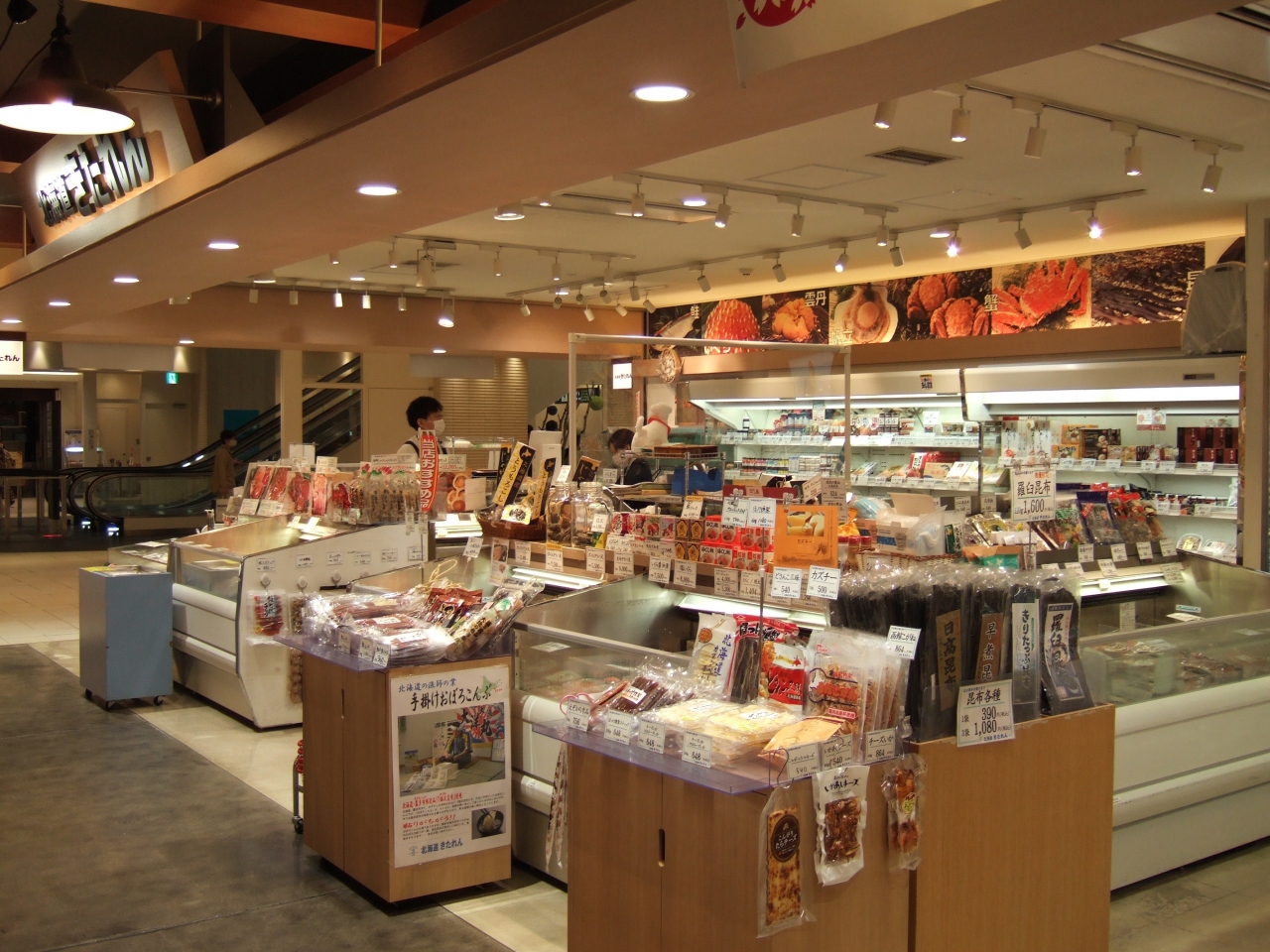 新千歳空港国内線ターミナルビルの2階、国際線に向かう中央通路にも面した海産物のお店。種類は豊富でカニのほか、旬のイクラやウニもあり、セットで買うと少し安くなっていました。