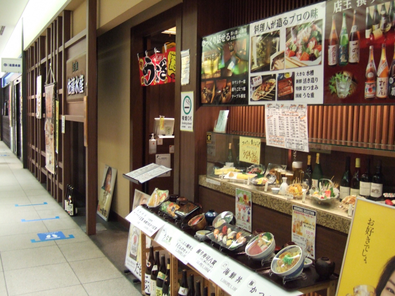 新横浜駅の新幹線側、キュービックプラザ1階のぐるめストリートにある海鮮のお店。お酒の品そろえも良く、ランチでは海鮮丼などが手軽に食べられます。こちらは4月以降も禁煙にならず喫煙席が残っていますが、扉で仕切られていました。
