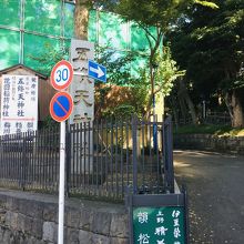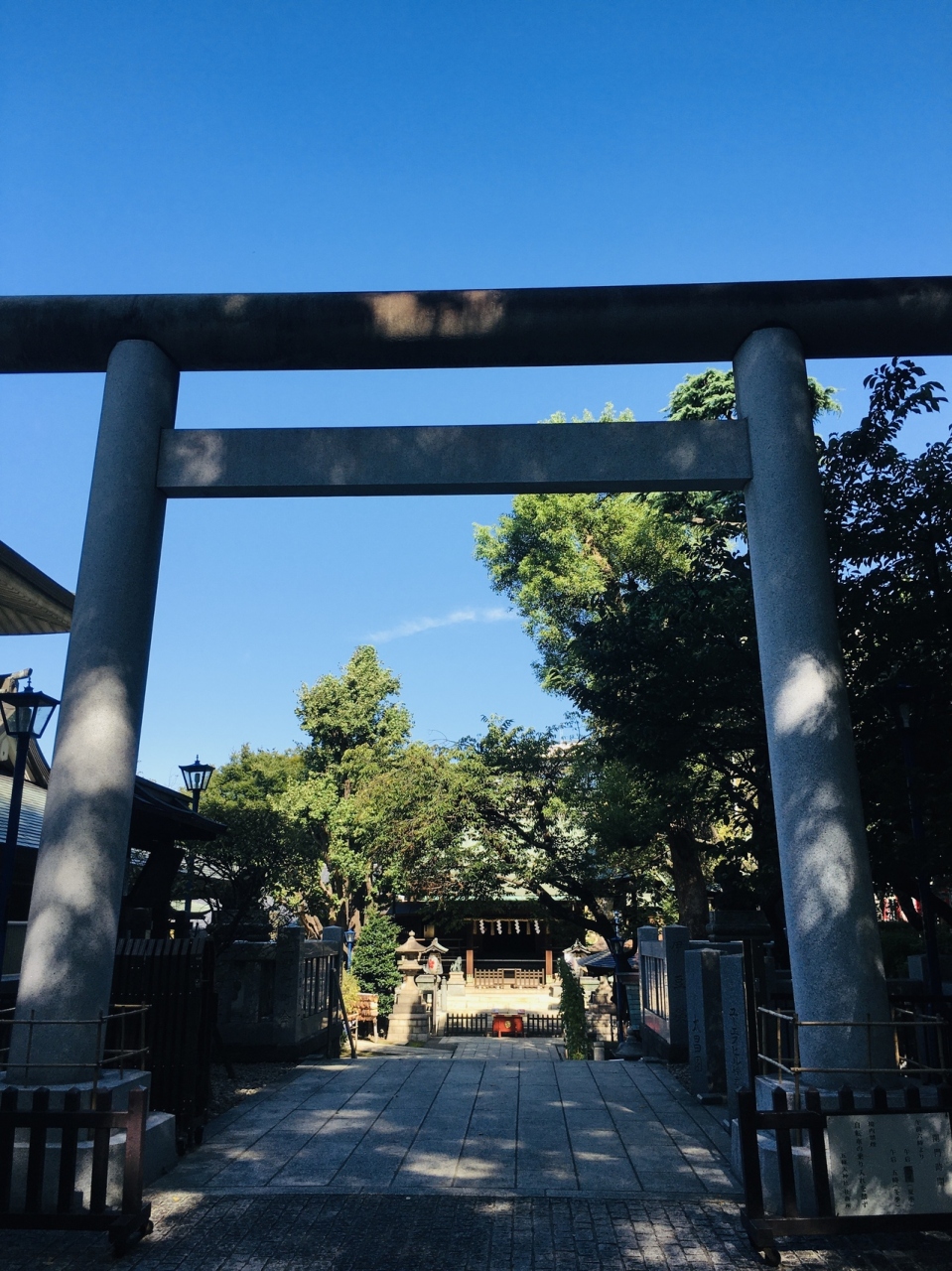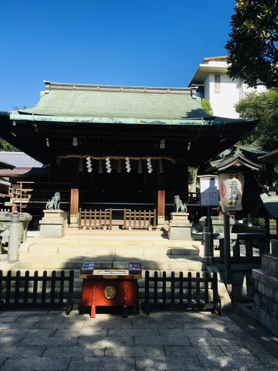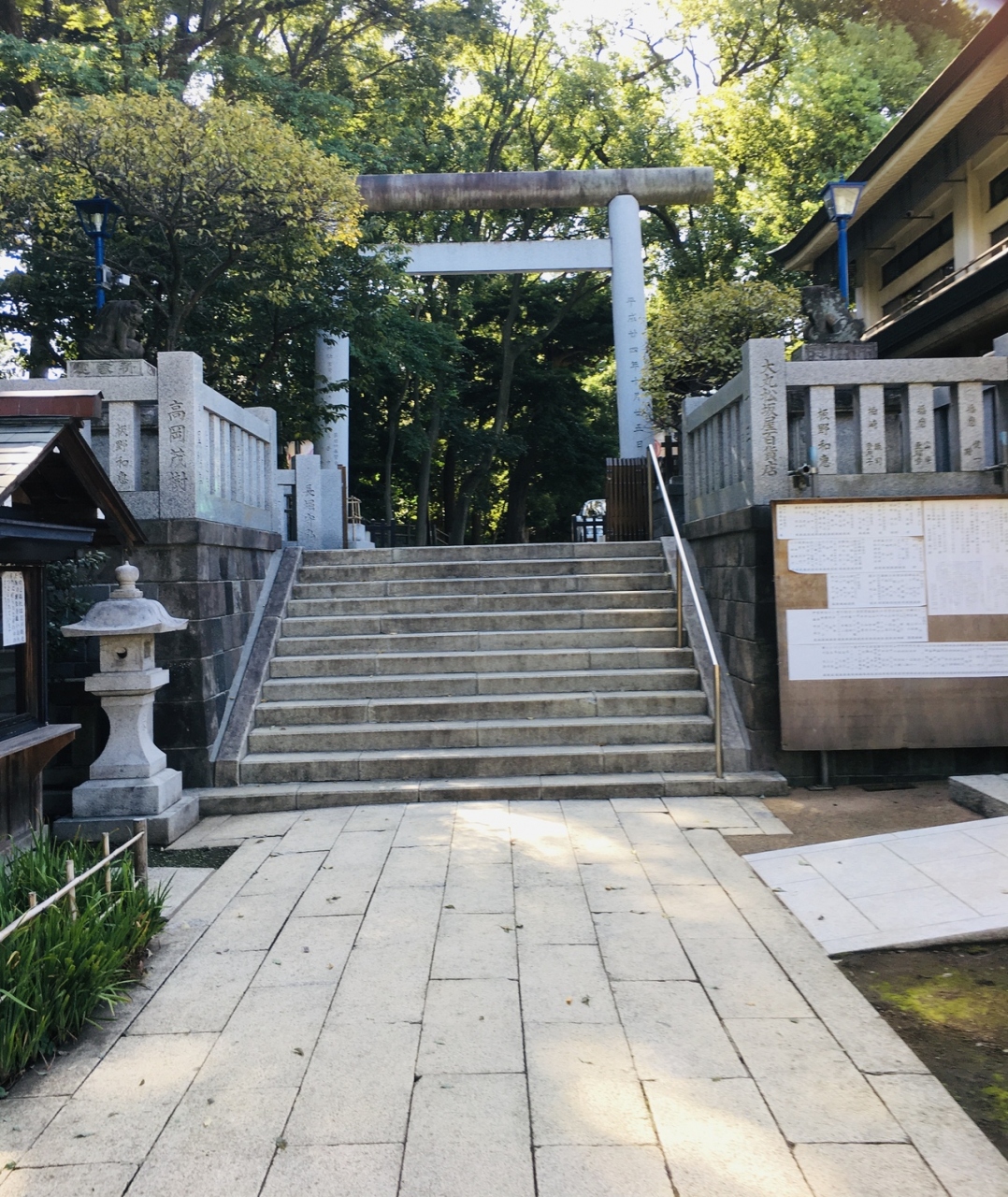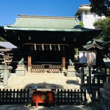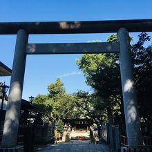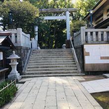 緩やかな坂を少し上がると大きな鳥居があり右側は社務所になっています。本殿の前に空間があり、空間は建物で木に囲まれたようになっています。本殿手前に柵があり、お賽銭箱があってお参りしました。出入口は3箇所です。