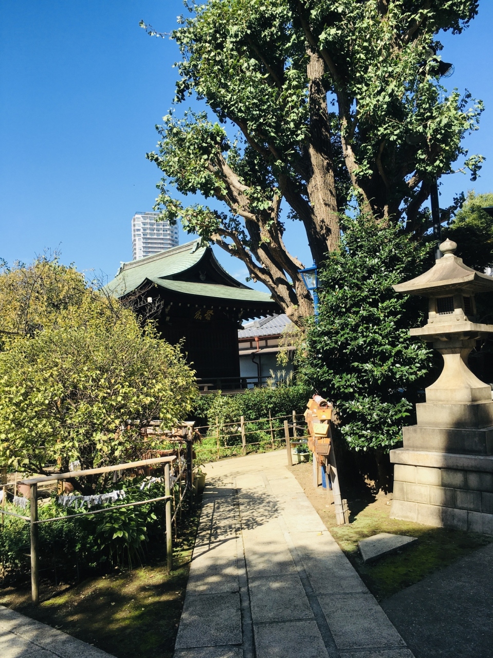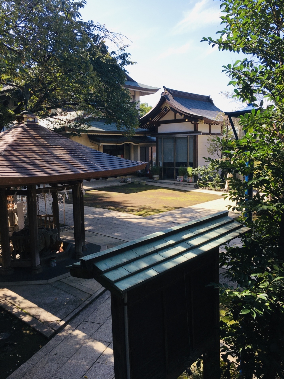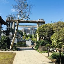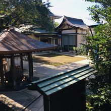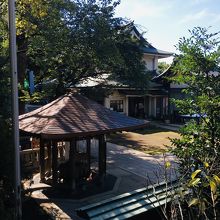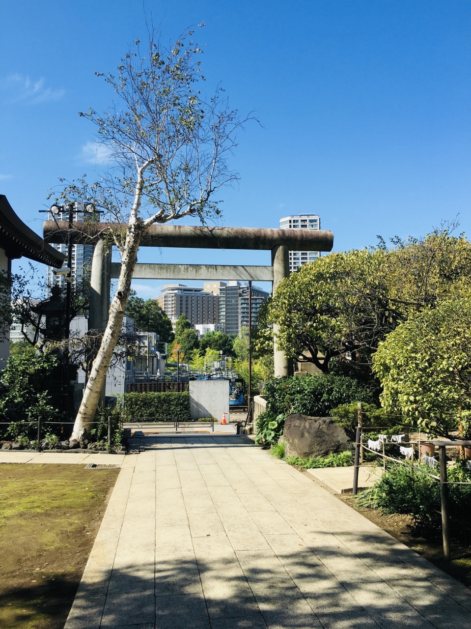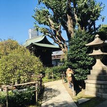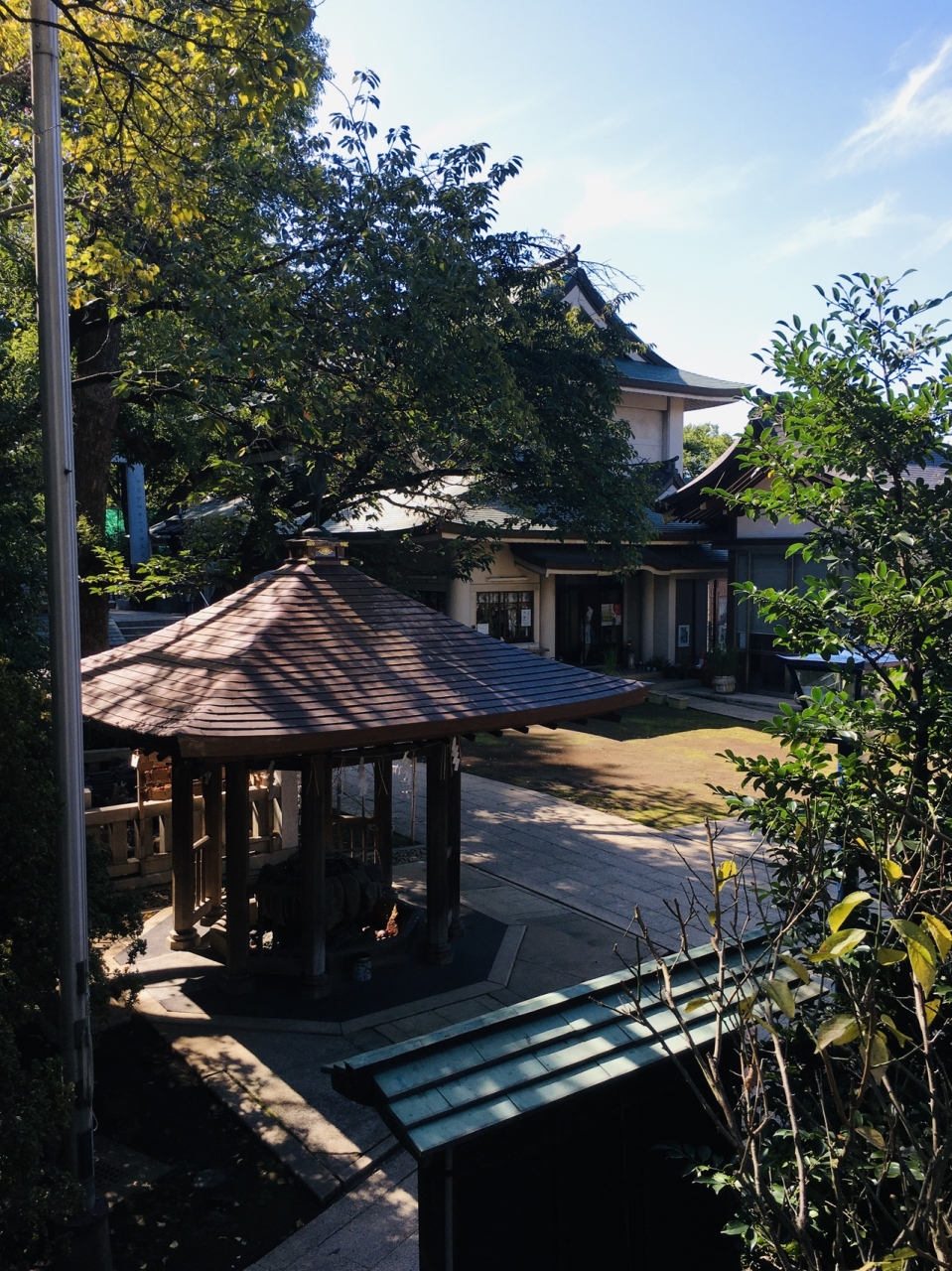 緩やかな坂を少し上がると大きな鳥居があり右側は社務所になっています。本殿の前に空間があり、空間は建物で木に囲まれたようになっています。本殿手前に柵があり、お賽銭箱があってお参りしました。出入口は3箇所です。