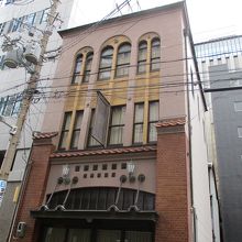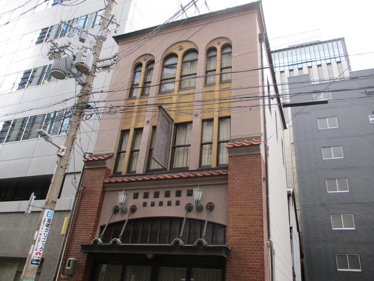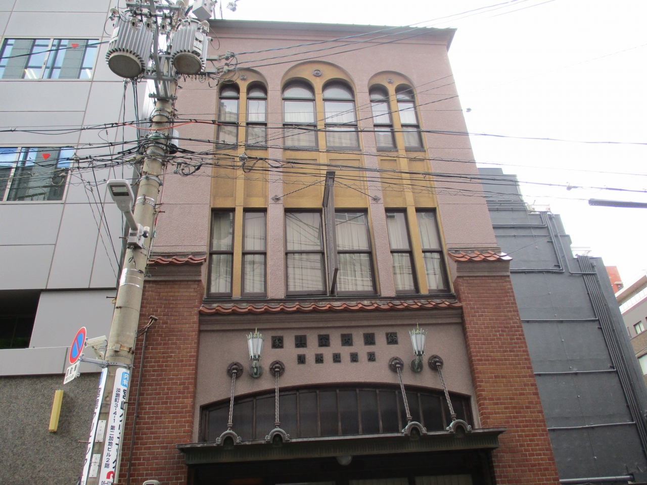 御堂筋の淡路3丁目信号から東へ入ってすぐ近くにあります。大正12年に建てられた家具室内商店用ビルで設計者は小川安一郎です。一階玄関上部に瓦があるなど和洋折衷の鉄筋コンクリート造り三階建てのビルです。外壁下の茶色のレンガと上のベージュのコントラスト、アーチ窓の外観が印象的です。
