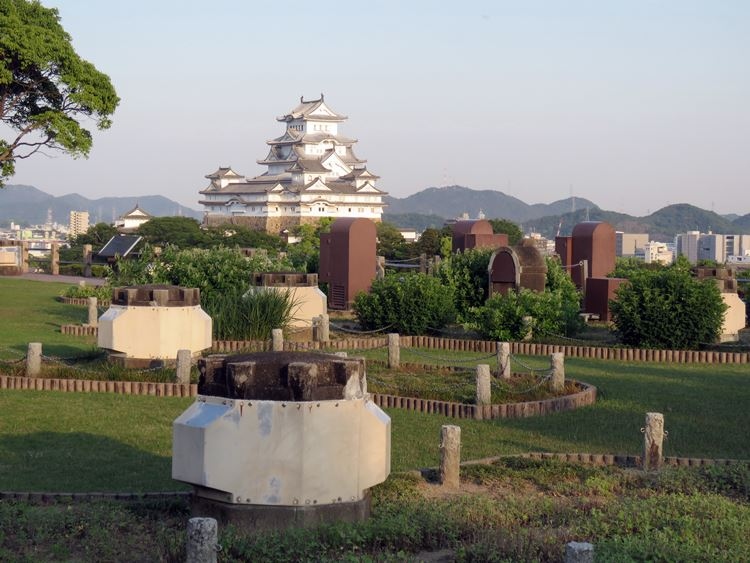 標高57.5mという小高い男山。その頂上部に配水池があって公園になっています。姫路城の北西の方角にあたり、自慢の連立式天守が東小天守も含め3つすべて見える穴場スポットです。特に午後から夕方の時間帯のほうが光が当たって姫路城が美しいように思いました。