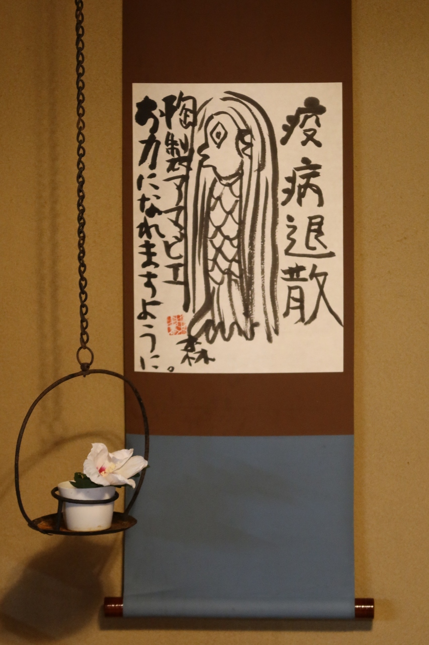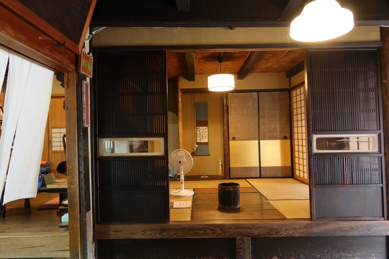 京都府庁の前から西洞院通りを100m程下った西側に生麩の老舗店の麸嘉の本店があります。江戸時代から続く老舗だけあり、暖簾の掛かった店構えに歴史を感じます。頂いたのは勿論名物の麩饅頭。笹の葉に包まれた麩饅頭はみずみずしく、冷たく、上品な味。あまえびの掛け軸を見ながら食べる麩饅頭はおつな物です。しかし、こちらで麩饅頭を食べるには予約をしなければ食べられません。行った時も追加で食べたかったのですが、品切れ。予約必須です。