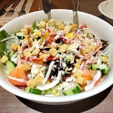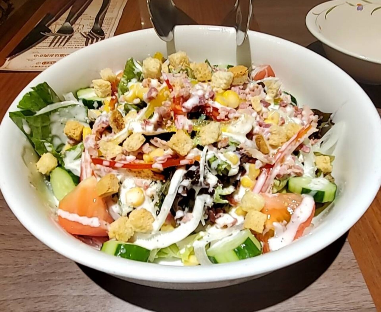 シーザーサラダを食べましたが、サラダも器がかなり大きくて山盛りでした。分けて食べるのがおすすめです。