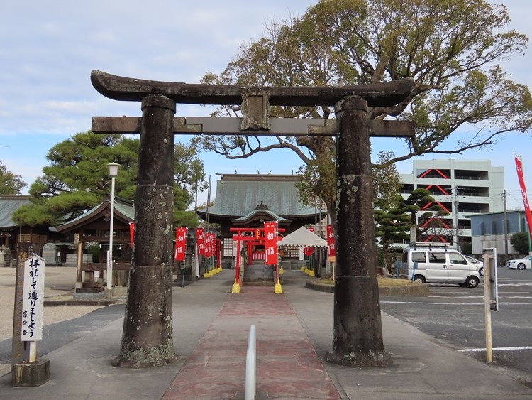 本来は佐賀駅南口から商店街を真っすぐ向かったほうが行きやすいのだと思いますが、このときは与賀神社の次に立ち寄ったので真逆の方角から路地を迷いながら進みました。12世紀に鎌倉の鶴岡八幡宮から勧請され、その後移転の後、17世紀からこの地に遷座された八幡様です。立派な石の鳥居の傍らに市の保存樹である楠が聳えていて目立ちます。