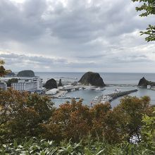 高台からウトロ港を見下ろせる