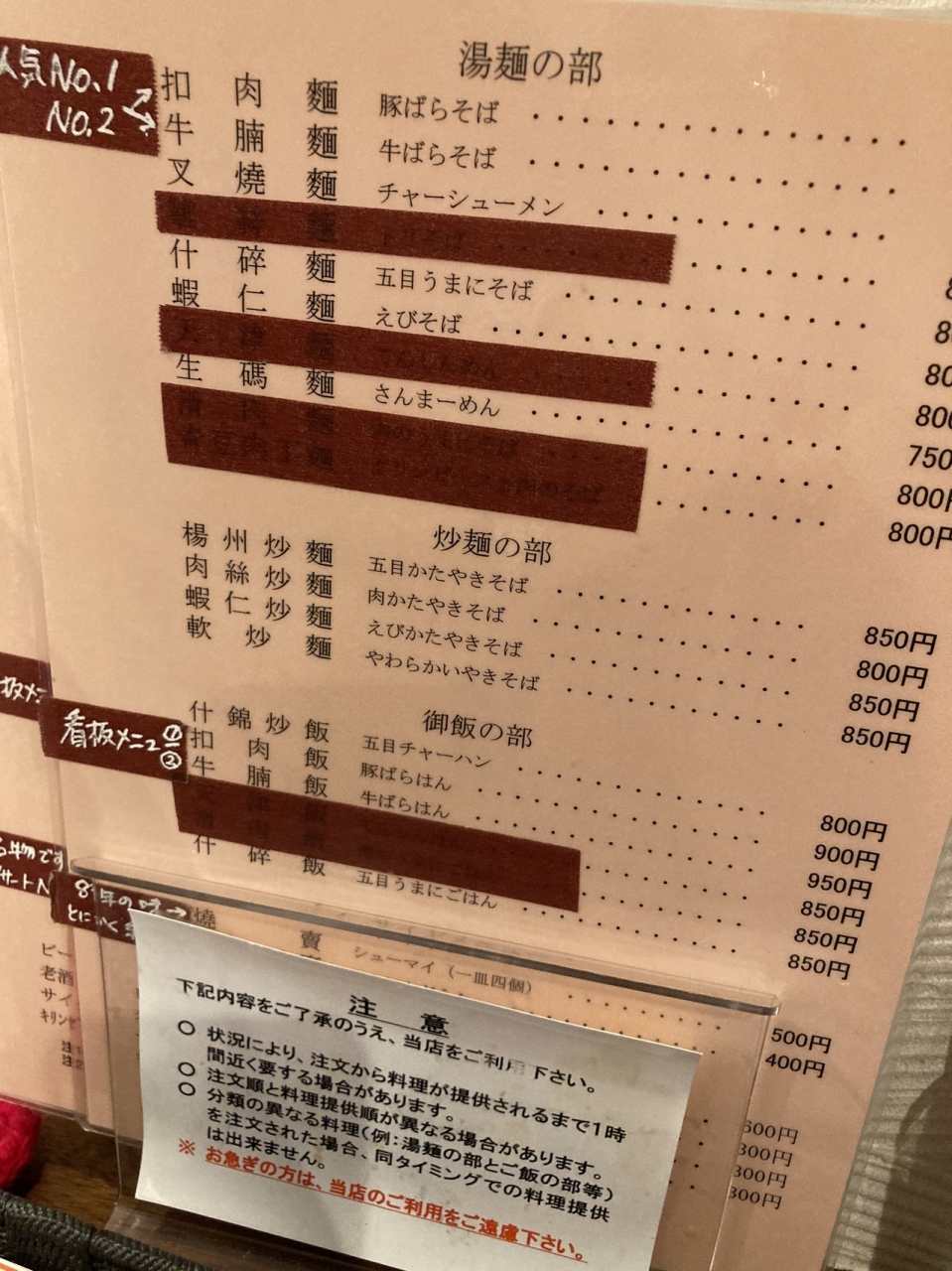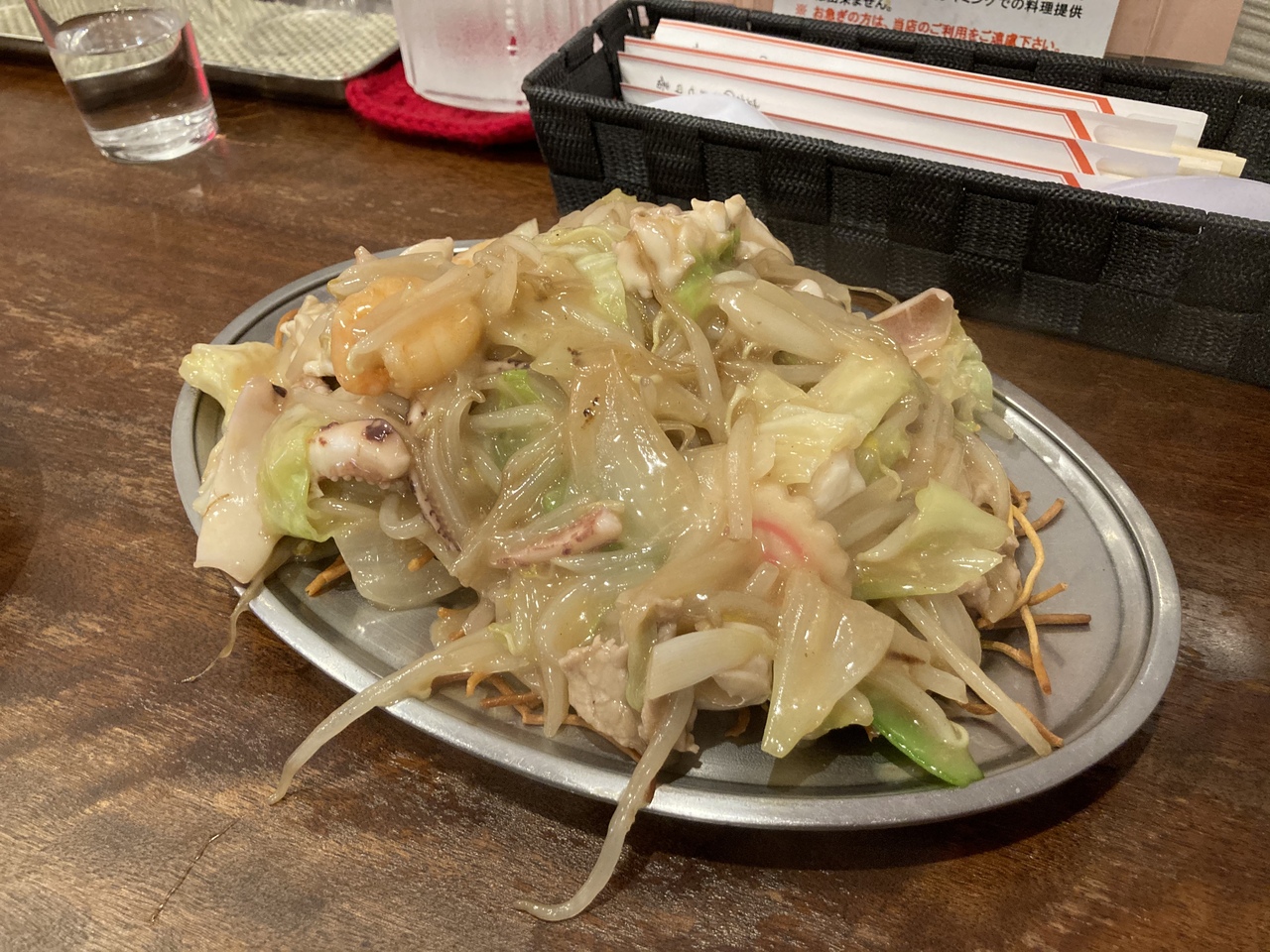 最初に、料理ができるまで時間がかかることを説明されます。かた焼きそばは注文を受けてから麺を揚げるので、特に時間がかかるそうです。でも、麺のパリパリした歯触りと芳ばしさがたまりません。待つ価値がある一皿です。味付けは甘めで、辛子と酢をちょっと足すと絶妙でした。牛バラ煮込みのご飯も、やはり甘めの癖になる味でした。どちらもボリュームたっぷり。次はもっと色々食べられるように、お腹を空かせて臨みます。