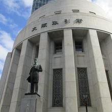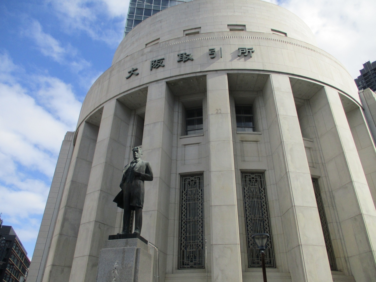 京阪、地下鉄の北浜駅からすぐのところにあります。白亜の円筒形ビルの正面玄関(昭和10年に完成した旧取引所で当時のまま保存されたそうです)の前に五代友厚の大きな像がそびえるように立っています。玄関を入ってすぐのところには誰でも利用できる飲食店などがあります。休憩にもぴったりです。