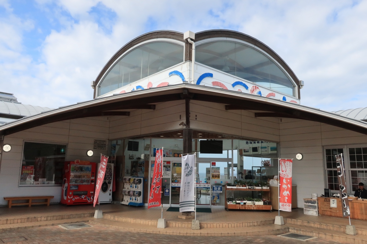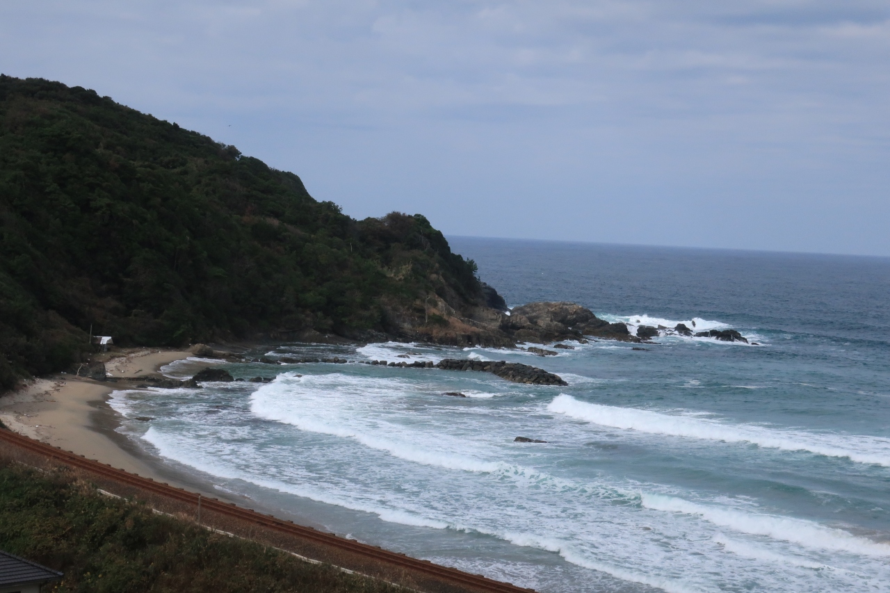 山陰道沿線ではないので立ち寄るのにわざわざ感があるが、JR山陰線と日本海を望むには絶好の場所だ。写真を撮影するスポットが設けてあったが、現地には列車の通過時間が貼りだされていた。その時間には立ち会えなかったが、初冬の日本海がこんなに白波が立っているのだと感激した。青空のもと、何本もの白波が打ち寄せる風景は美しい。駅名通り、夕日も素晴らしそうだ。