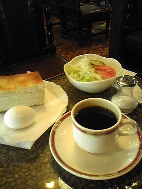 モーニングセットは、分厚いトースト、サラダ、ゆで卵に、コーヒー付きで430円。