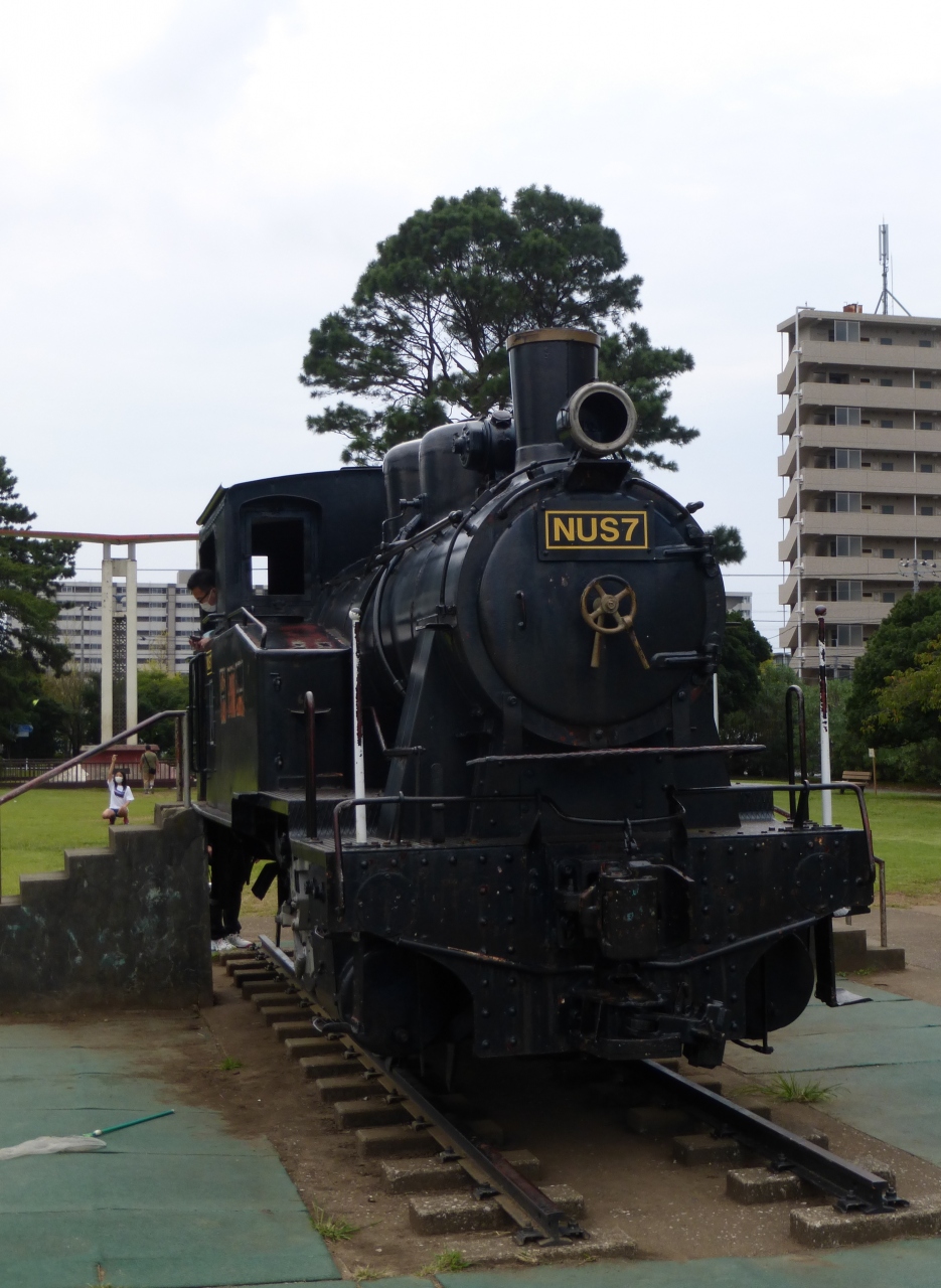 公園の中央に可愛らしい蒸気機関車が有ります。蒸気機関車NUS7で、1907年(明治40年)の英国製です。国鉄で使われた後、川崎製鉄千葉製鉄所で1969年(昭和44年)まで使われていたそうです。