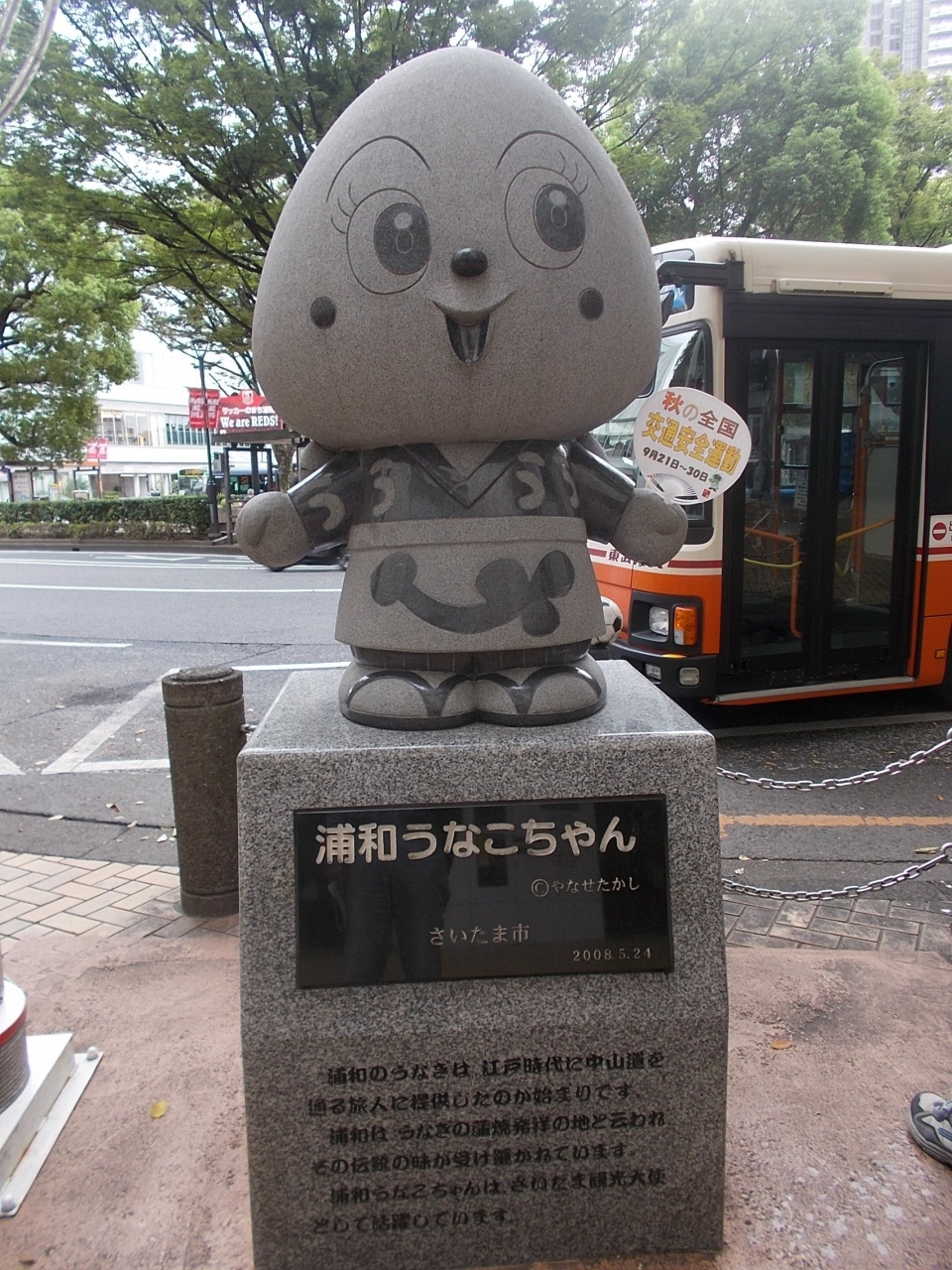 このうなこちゃん像はJR京浜東北線浦和駅西口広場にあります。以前は浦和駅西口にでると目の前にありました。今は伊勢丹とコルソの間ぐらいの場所にあります。やなさたかしさんの作品です。浦和のうなぎのイメージが親しみをまします。