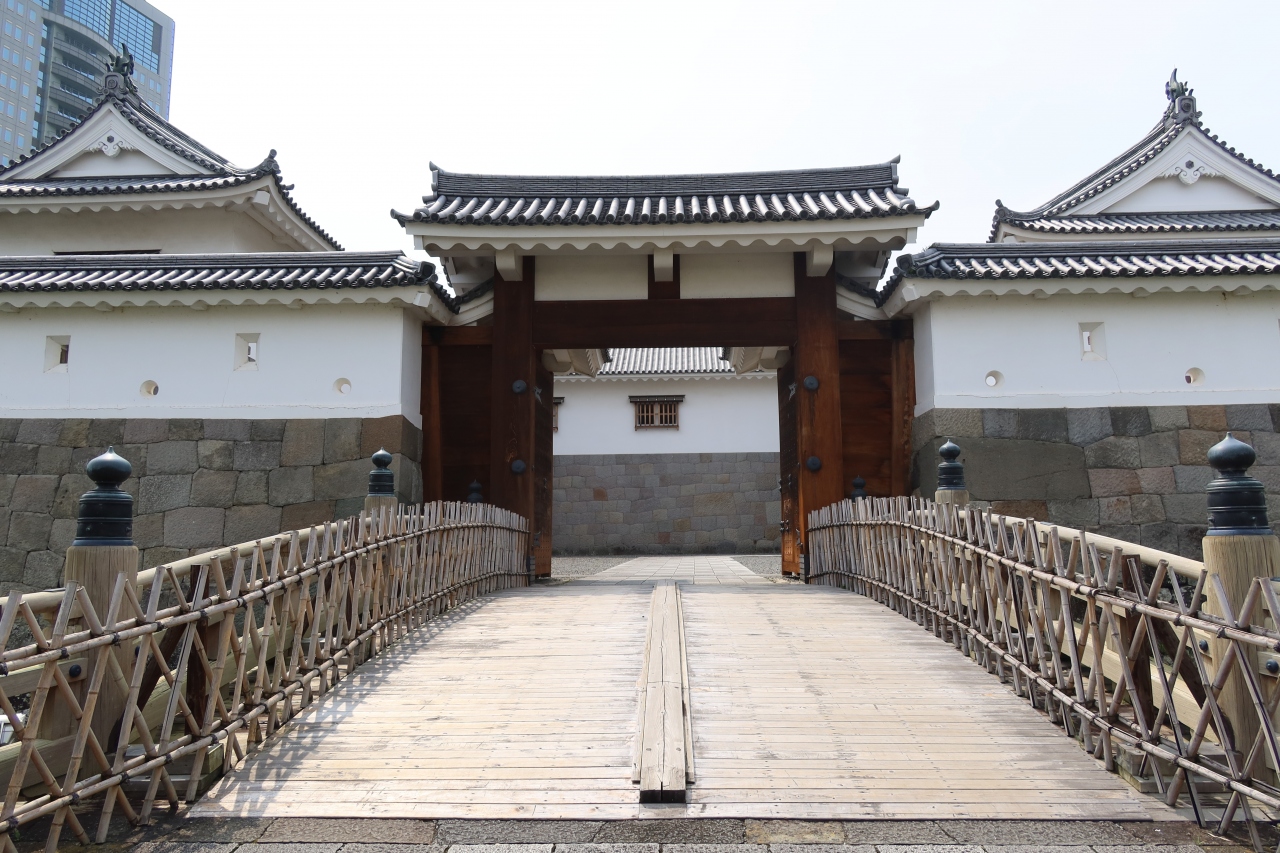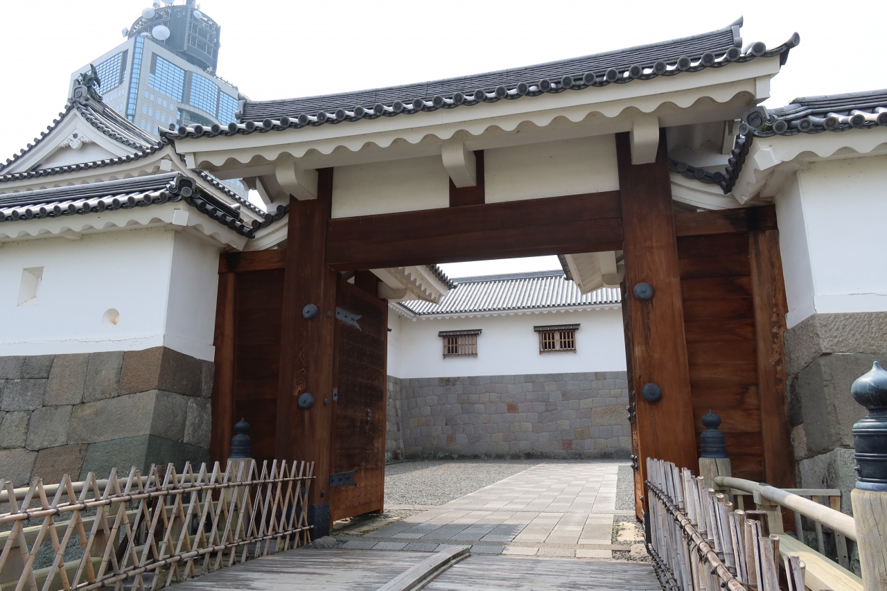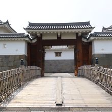 駿府城公園の南東部の入口に東御門があります。東御門は典型的な桝形門で濠に架けられた橋の先にある高麗門と、桝形の先にあるのが櫓門です。桝形の外側にある高麗門は櫓門に比べ簡素な造りですが、橋と高麗門を組み合わせたお城の防御機能が分かり易いです。