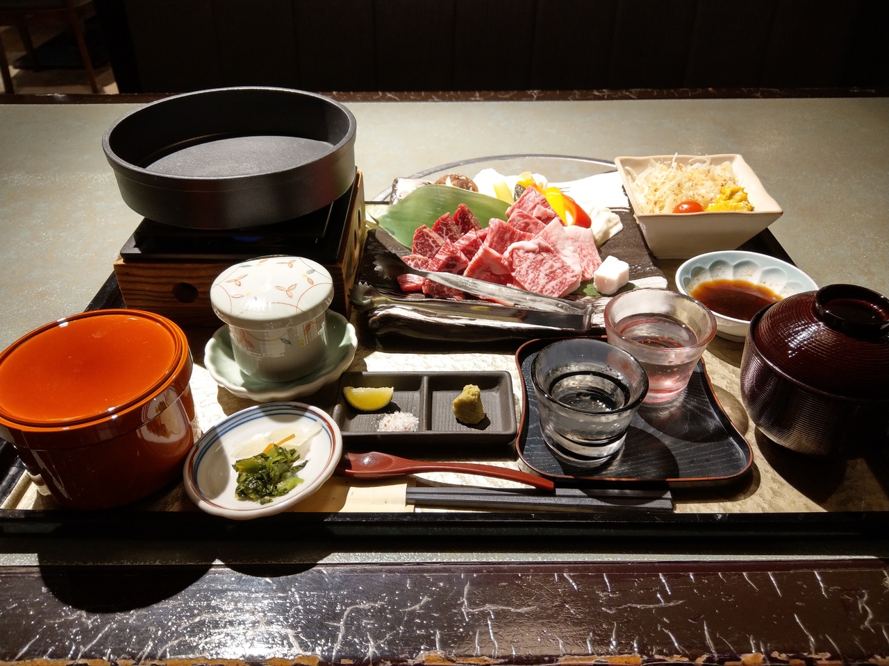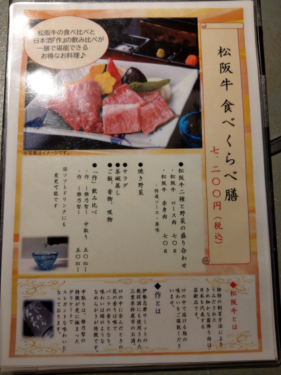 魅力的なメニューが豊富でしたが、お手頃でグランドメニューにはなかった、松阪牛のロースと赤身の食べくらべ膳に即決。三重の日本酒「作(ざく)」の吟醸と大吟醸の飲みくらべも付きます。陶板焼きで自分で焼くので、美味しく食べるために集中します。岩塩、わさび、すだち、タレを好みで。言うまでもなく大満足の松阪牛食べくらべでした。