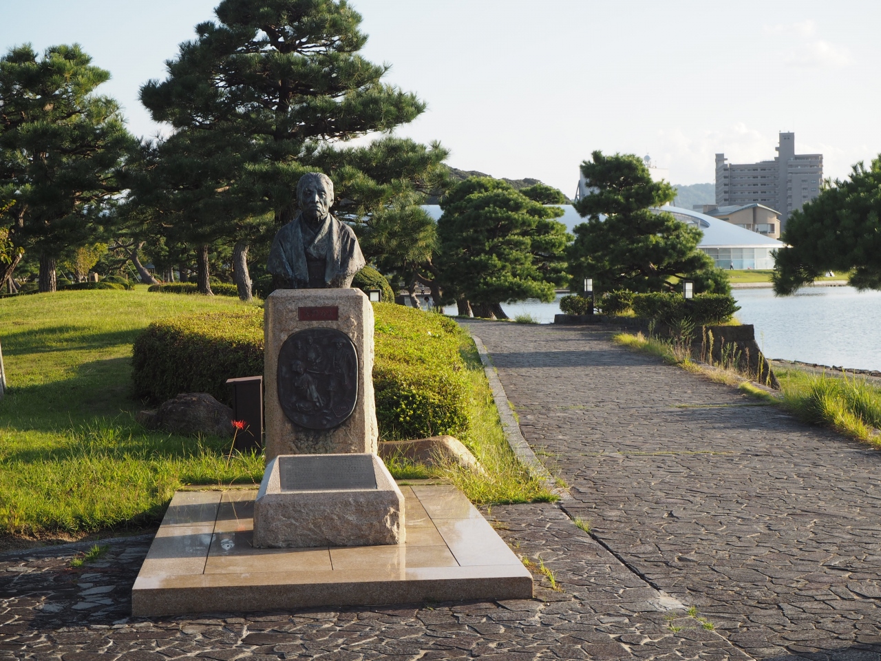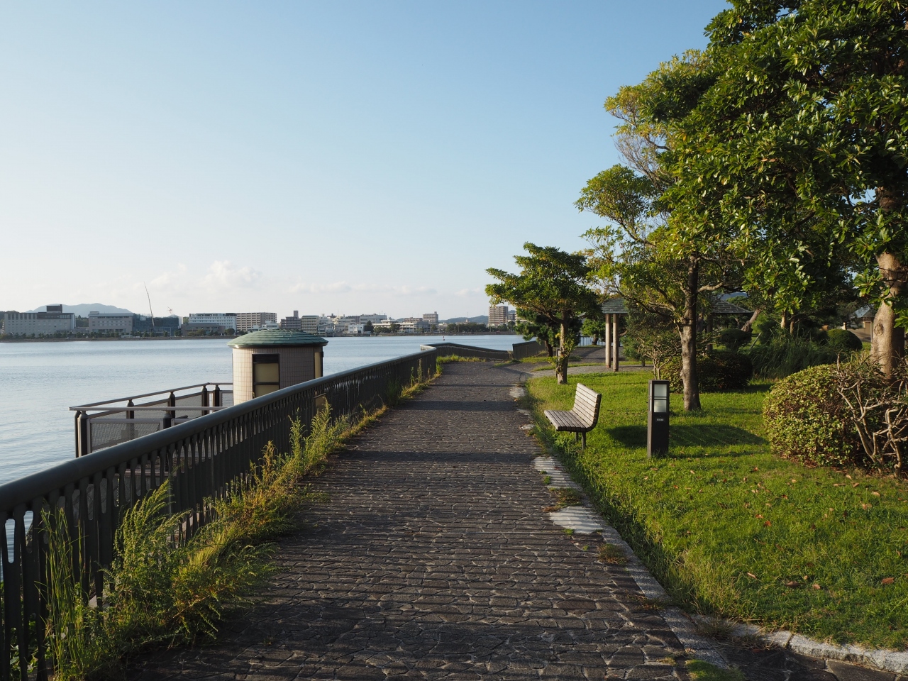 松江市街地の西の端の宍道湖に面して湖畔にあるのが松江湖畔公園です。松江湖畔公園は千鳥南公園、白潟公園などを含んだ総称です。湖畔沿いに面してある公園なので、細長い公園になっています。公園内は遊歩道や芝生の緑地や松の木々などがあり、歩いていても楽しい感じです。観光客以外にも地元の方も犬を連れての散歩姿も見かけました。天気がよければ夕方には宍道湖に沈む夕日も見られます。