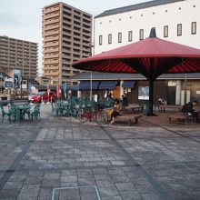 カラコロ広場は京町商店街の北の端にあり、松江城の外堀に面してあります。川の向かいには旧日本銀行の松江支店のカラコロ工房があります。カラコロ広場は広く、なかほどには大きな赤い傘があり、イスなども休憩ができるようになっています。広場周囲には飲食店があります。広場の一角には御朱印書の店があり、松江堀川めぐりの遊覧船乗り場もあります。
