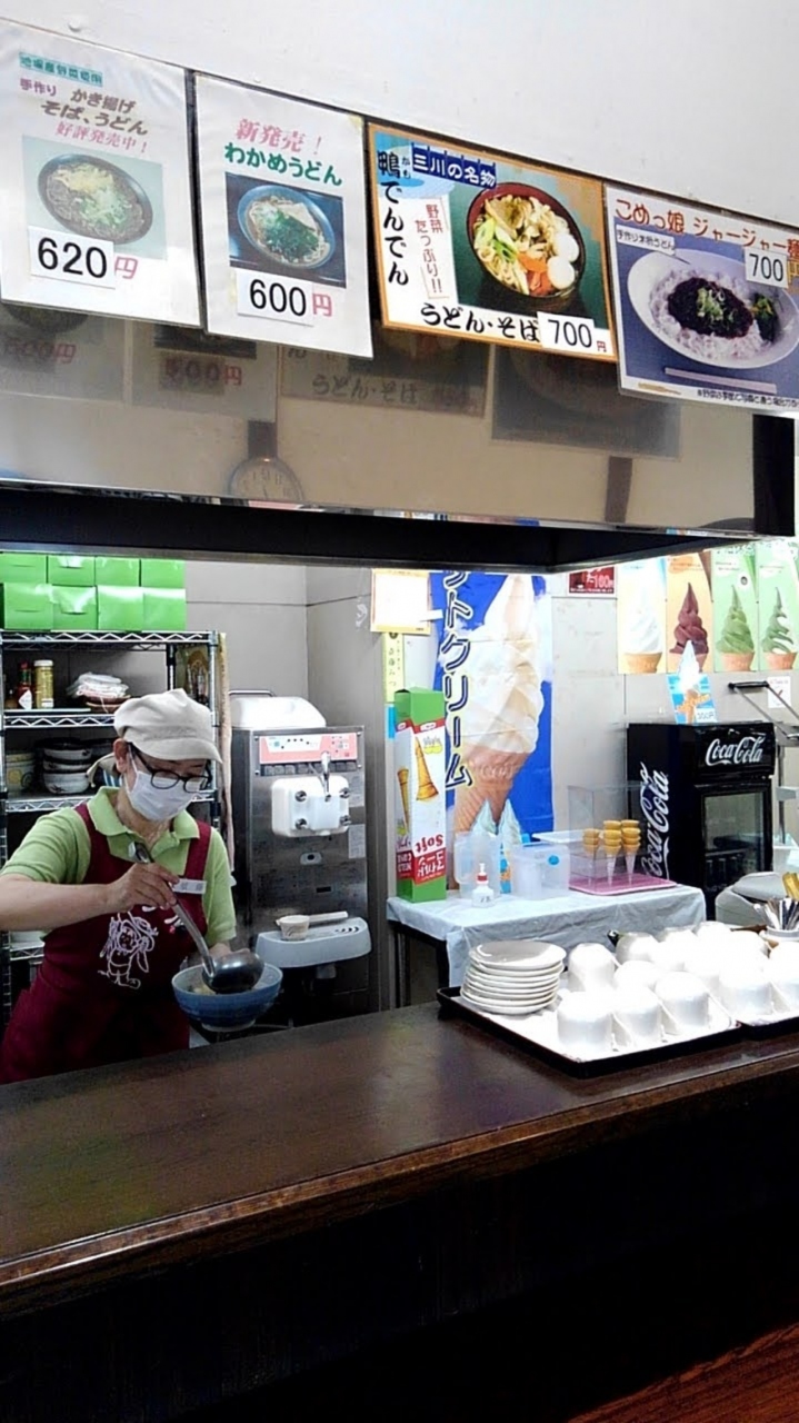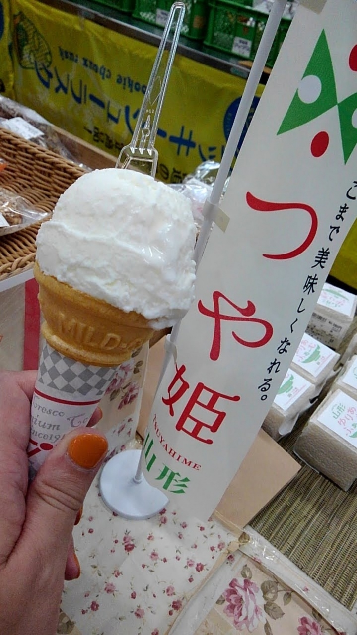 こちらの道の駅の隣にある温泉施設で癒されたあと、いろり火の里の食堂で山形・庄内の旅の最後の食事をしました。産直売り場と食堂が一緒になっていましたが小さかったです。食堂は、観光客向けではなく地元の人たちばかりのようでした。食券を購入してセルフサービスの食堂でした。『鴨でんでんうどん』がオススメとあったのでそちらにしてみました。腰のある細いうどんで、とっても美味しかったです。700円でした。食後のデザートでつや姫ジェラート300円を頂きました。米の甘さがちょうど良く、こちらも大変美味しかったです。