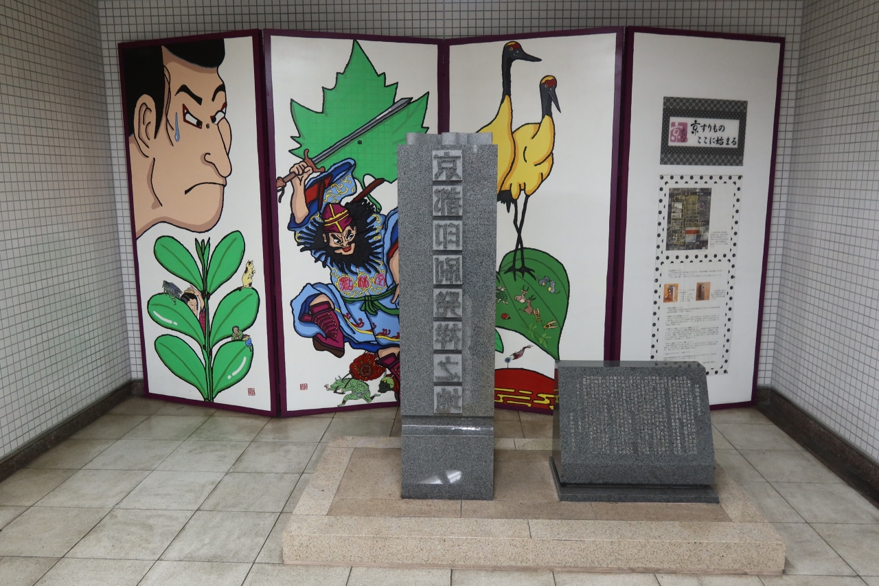 京都市営地下鉄烏丸御池駅の南改札に近い所に京都印刷発祥之地の石碑があります。明治3年に烏丸通りに點林堂という活版印刷の印刷所が最初に開業したことに因んで建てられた碑です。改札内にある発祥之地碑と言うのは珍しいですが、電車に乗る人は見入ることもなく、何故地下鉄構内設置したのか分かりません。