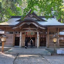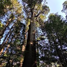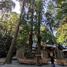 高千穂のバスセンターから徒歩で10分ほど、700メートルぐらいです。高千穂の郷土文化である神楽の中心地として名高い。境内には杉の巨木が多くあって圧倒される。宮崎の巨木100選にも選ばれた秩父杉(樹齢800年)、夫婦杉など。