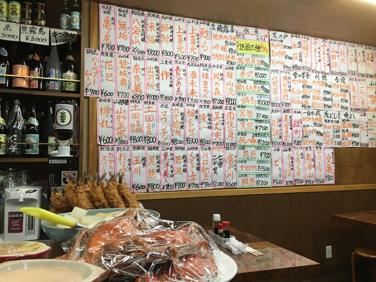 今は予約がないと入れないほど人気居酒屋です。テーブル席は相席当たり前です。久しぶりに前日予約すると6時までなら、とのことでした。当日お邪魔すると予約がキャンセルになったのでゆっくりどうぞ、と親切な対応でした。日本酒のラインナップが見事で短冊が壁に貼られています。