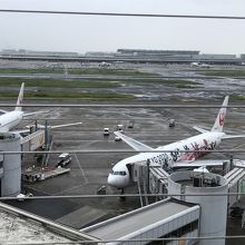 羽田空港のマーケットプレイスの6階に展望デッキがあります。そこからも飛行機はよく見えるのですが、もう1階外の階段を上がったところにガリバーのデッキがあります。屋外で屋根があるわけではないので、天気や気候の良い時は、最高の場所だと思います。が、訪れた日は、雨。傘を車に置いてきたので、落ち着いてみることができずに、早々に引き上げました。