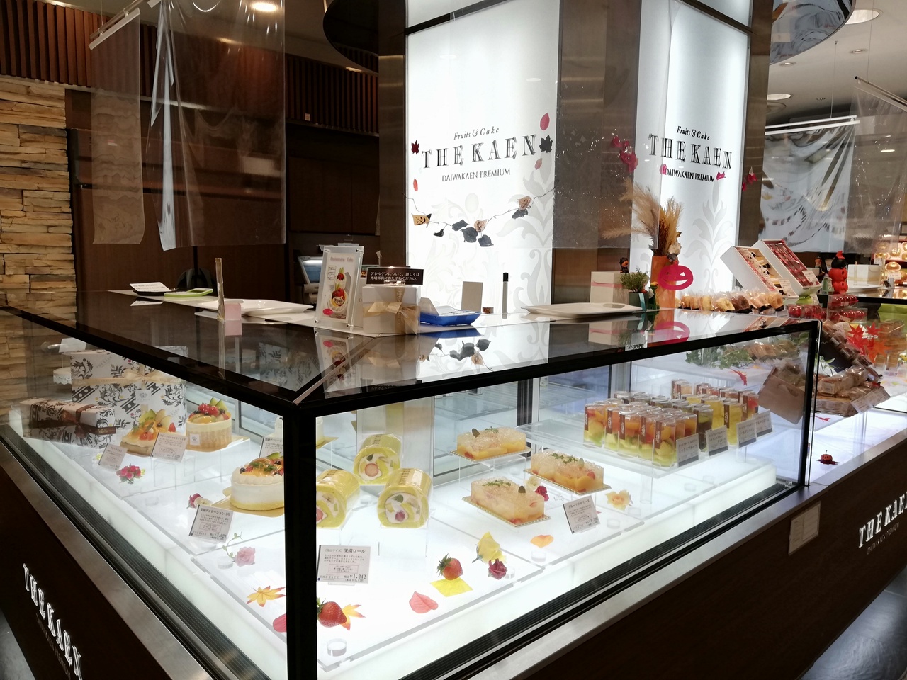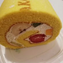 果園ロールを買いました!フルーツ屋さんの洋菓子だけあって、フルーツが丸ごと大胆にゴロゴロ入っていて、オススメです♪一本の半分(ハーフ)でも4カットできました。フレッシュジュースの販売もあり、前と近くに数席のみですが椅子もあります。