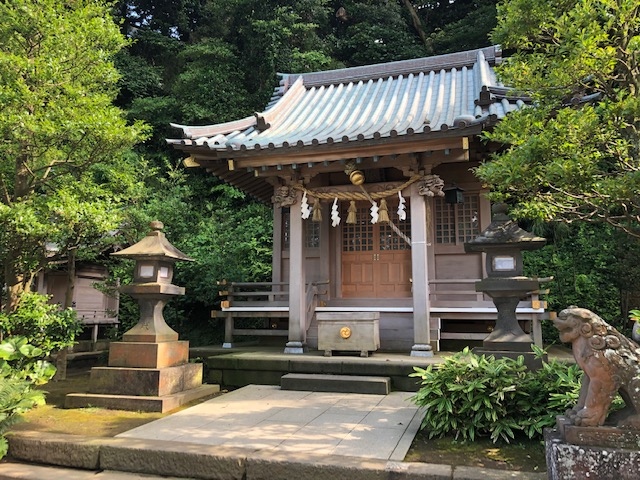 八坂神社の御神体は、もともとは腰越(江ノ島の対岸にある小高い丘があるところ)の小動神社に祀られていたものでした。小動神社の社殿が大波で壊されてしまい、近くの洞窟の海中に沈んでいた御神体を漁師が拾い、ここに祀ったと言われています。この由来をもとに、7月中旬には江の島の天王祭が行われ、海上でのお神輿、対岸にある小動神社との行合いなどが行われます。