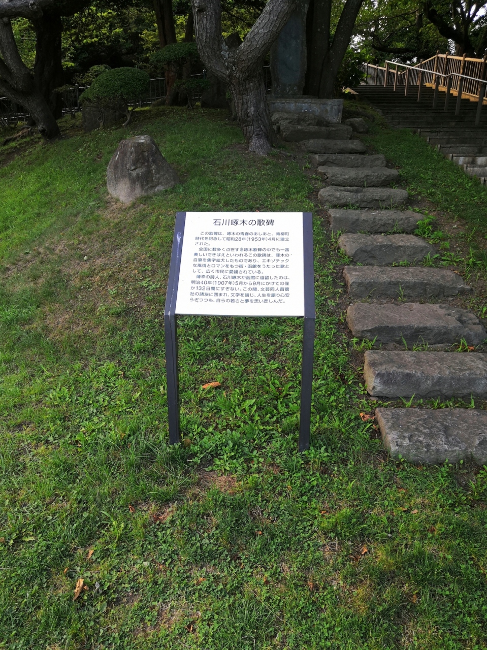 函館公園内に建つ歌碑です。有名な(函館の青柳町こそかなしけれ 友の恋歌 矢ぐるまの花)という歌が刻まれていますが、この手の石碑の常で非常に読みにくいのでそのまま読むのは難しいです。場所ともに、知っておかないと、見つけにくいです。
