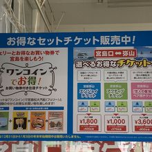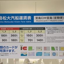 宮島口から、宮島に渡るためのフェリー乗り場。JR西日本フェリーと宮島松大汽船の2社が運行しています。どちらも片道180円、往復360円。交通系ICも使えます。オススメはお得なチケットがある宮島松大汽船。500円で往復券ともみじまんじゅうのセットや、1,800円で往復券とロープーウェイ往復がセットになっていたりしますので用途に合わせて購入が良いです。