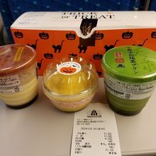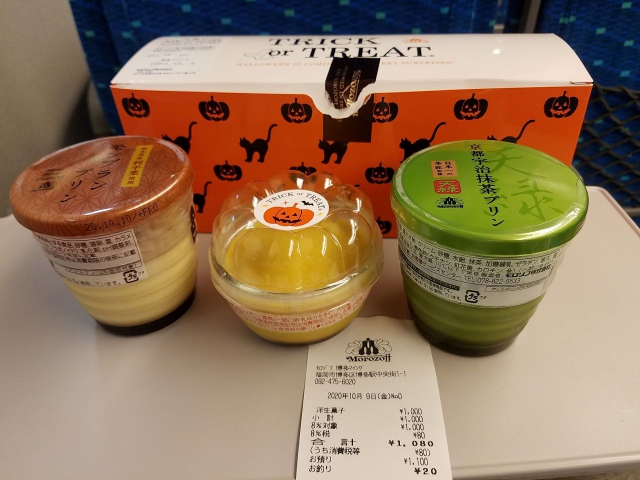 GoToトラベルで貰った地域共通クーポンが余ったのでマイング博多を一回りして新幹線の中で食べる昼食を物色しました。さんざん見て回りましたがモロゾフのプリンが目に入ったので購入。モンブランプリン、京都宇治抹茶プリン、かぼちゃのプリンがセットになっていてお得でした。