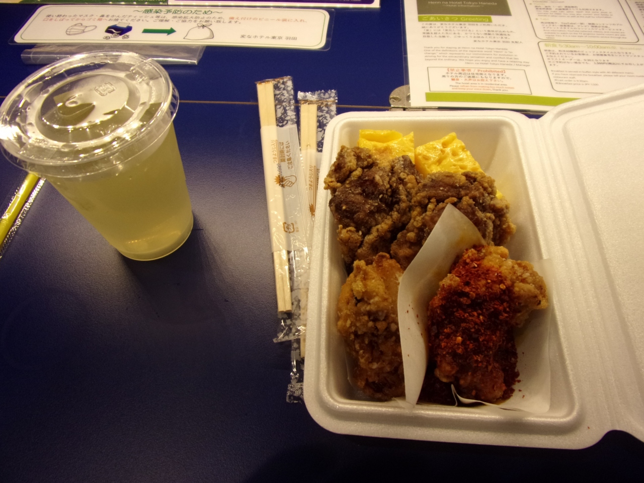たまご焼き付きのから玉3個のから揚げ(498円税別)とレモネード(98円税別)を購入。