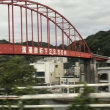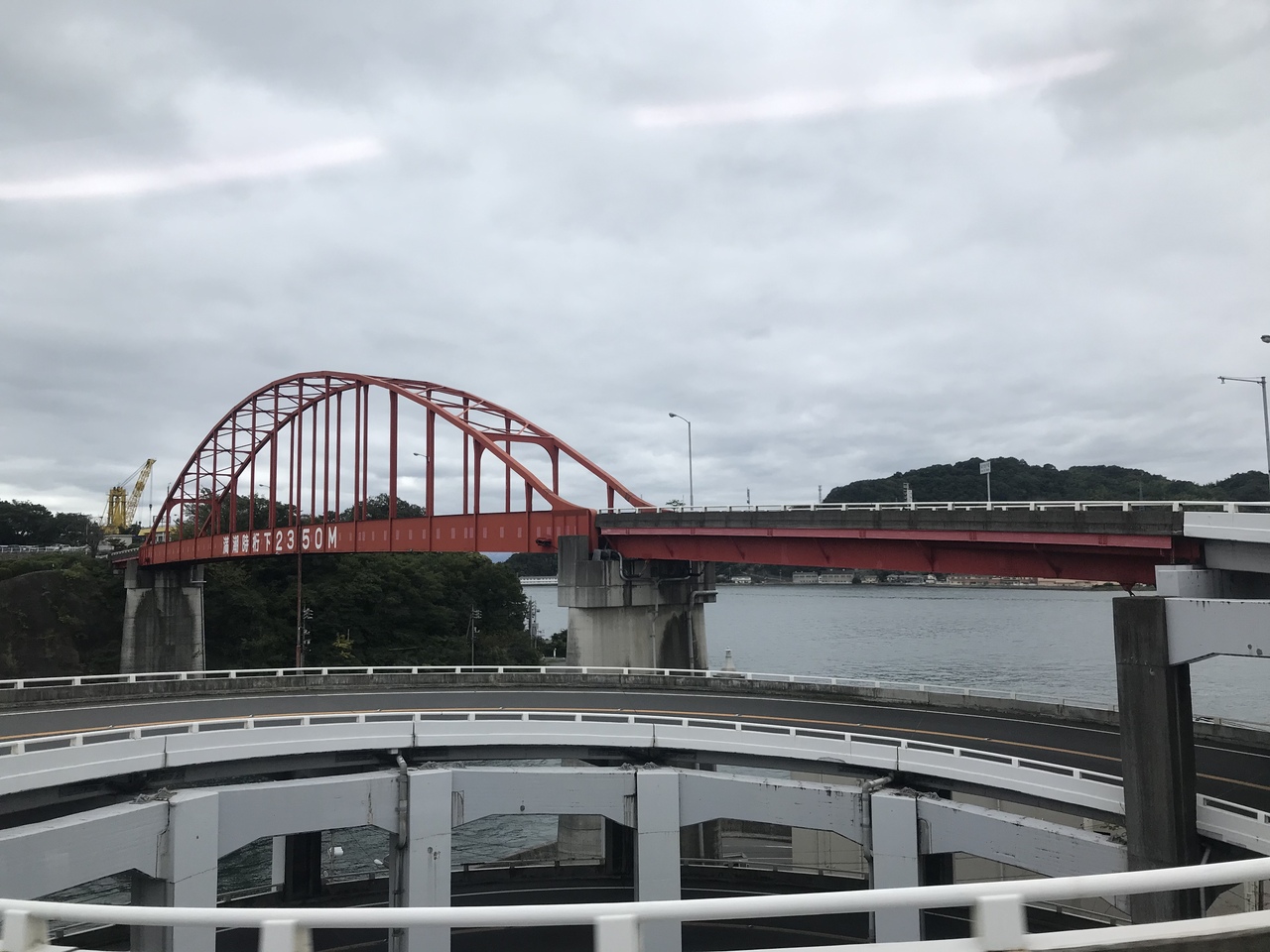 橋の赤い色は厳島神社の鳥居の色に合わせているとか。倉橋島側が螺旋状の高架橋になっており、橋を渡るまでに2回転半して渡るのだが、徒歩で渡ることはできないので、車でない場合、呉駅から倉橋島方面に向かう路線バス(桂浜、藤の脇方面に向かう広電バス)に乗車すれば橋を渡ることが出来る。呉駅からは1時間に1~3本程度ある。