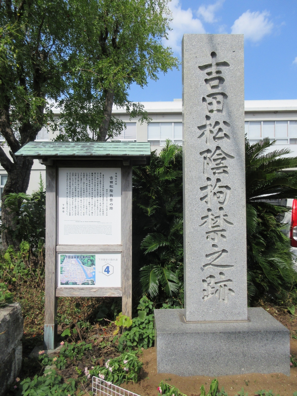 ペリー来航の際、ペリー乗船の船で密航を企て失敗、自首した吉田松陰と金子重輔が拘束されたことを表す大きな石碑が建っています。かつては長命寺という寺があったそうですが廃寺になり、現在は中央公民館になっています。今でこそ容易に海外に出かけることができますが、当時、開国したばかりの日本で、海外に目を向けていた二人の言動とチャレンジ精神は素晴らしかったと思います。