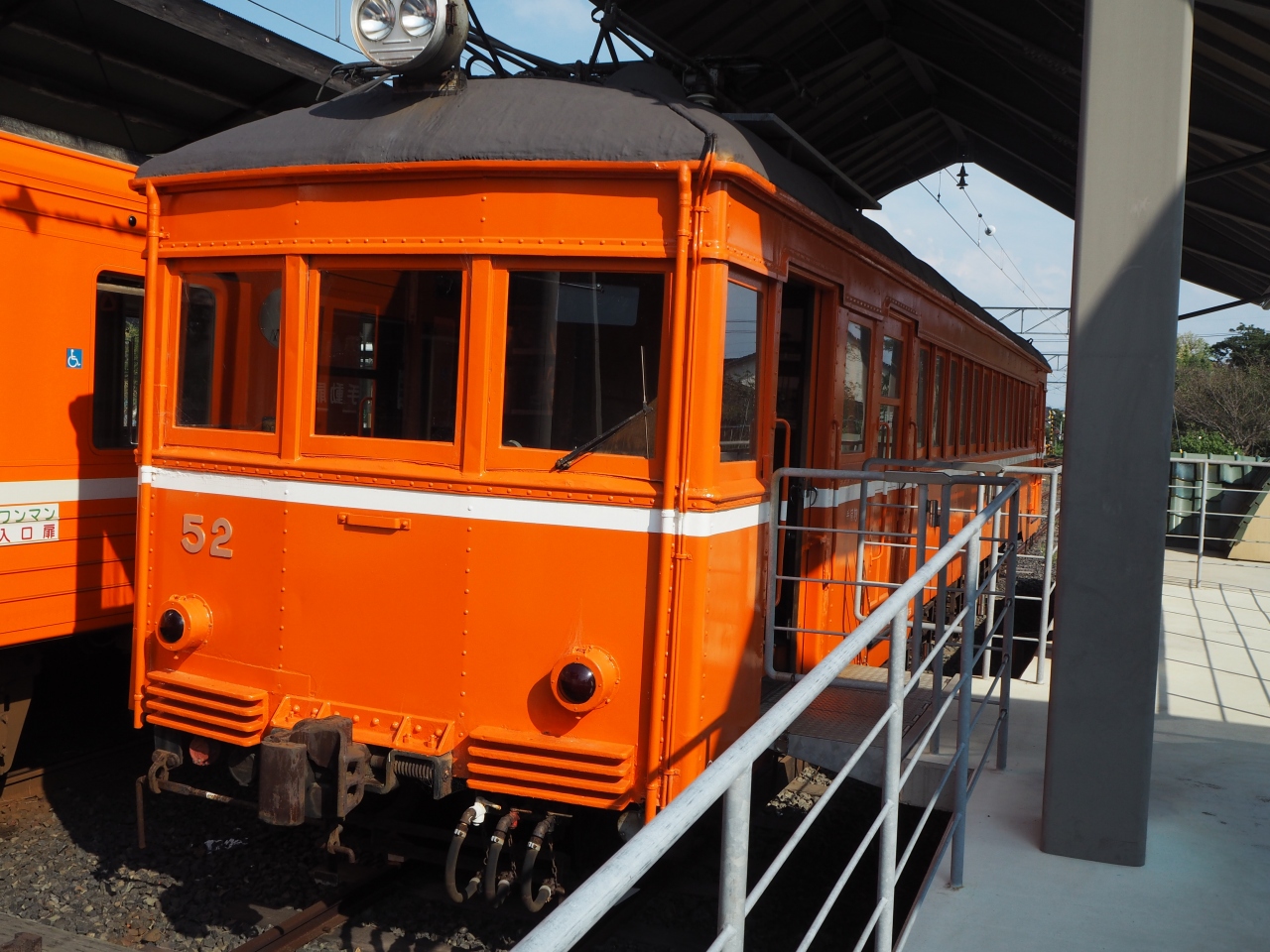 一畑電鉄の出雲大社前駅にデニハ50形、52号車はあります。出雲大社前駅のよこの広場の縁結び広場から車両の見学が、自由に、無料でできます。車両はオレンジに色に塗られた外観で、なかはレト感漂う席、天井、窓があり、とても風情がある感じです。また運転台も見ましたが、操作が2種類くらいしかないというすごいシンプルさの驚きました。