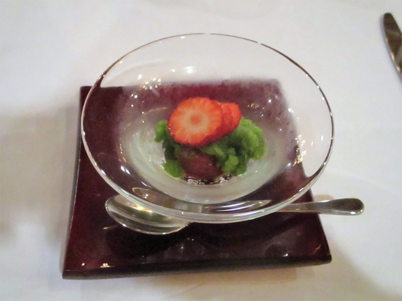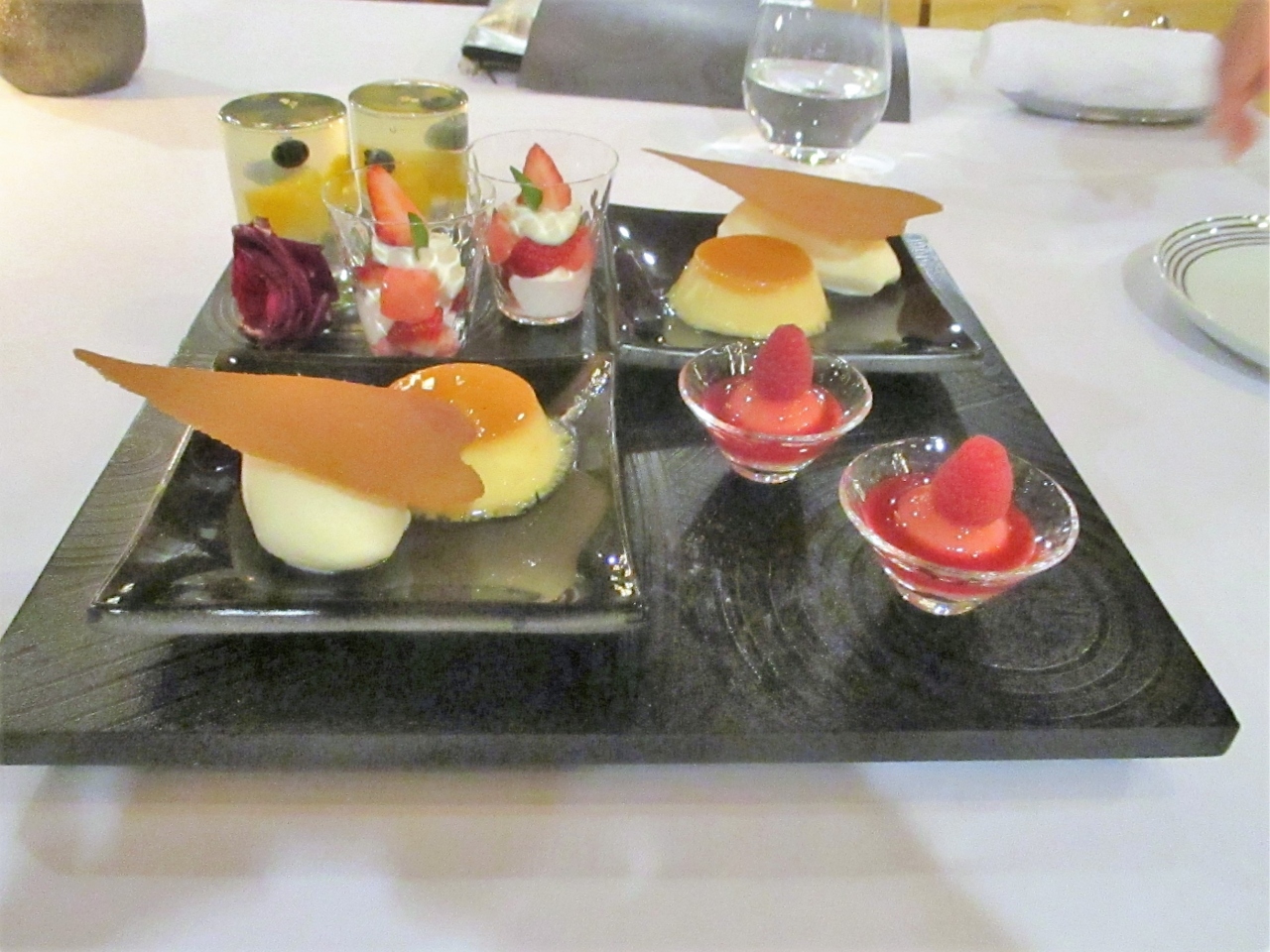 *アシェットデセール クレームキャラメル、ヴァニラアイスクリーム、木苺のムース、フルーツとレモングラスのゼリー、苺のパルフェ