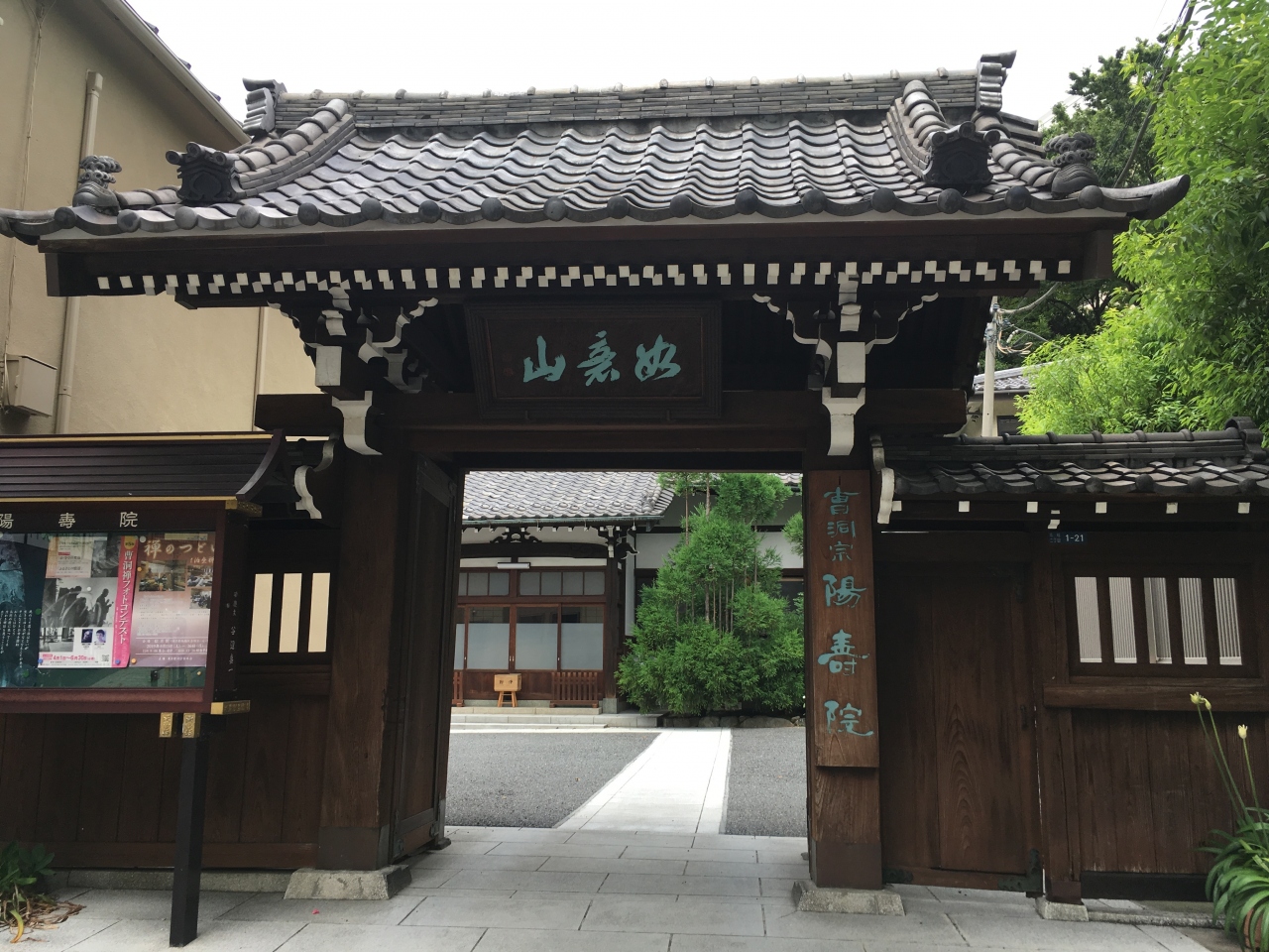 陽寿院は、泉岳寺駅から徒歩約3分のところにある曹洞宗の寺院です。6月に泉岳寺を参拝した後に立ち寄りました。素敵な山門が拝観者を迎えてくれます。この寺院は、1654年に泉岳寺の塔頭寺院として創建されたとのことです。神社仏閣に興味がある方は近くの泉岳寺と共に参拝されては如何でしょうか。