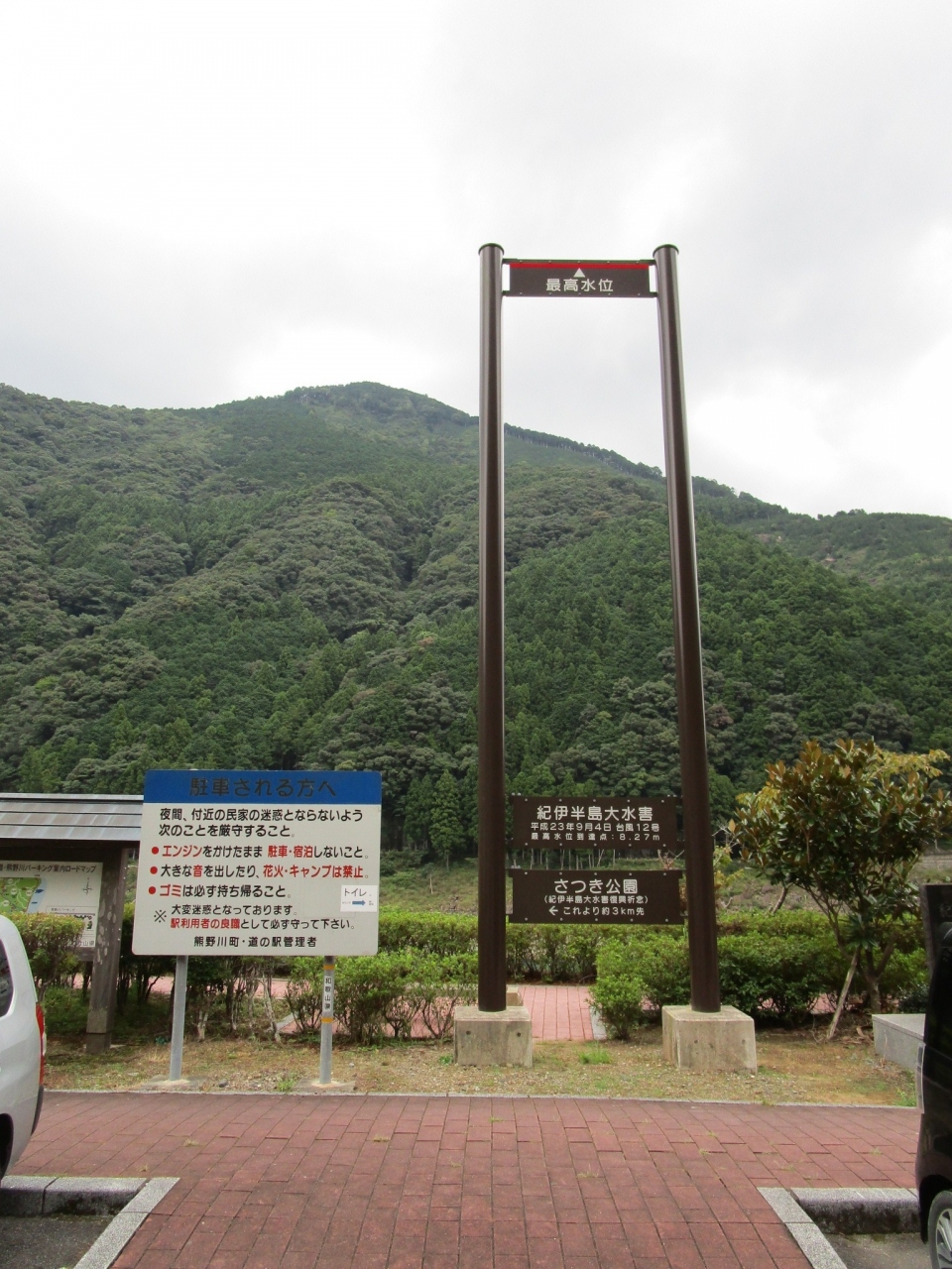 青く美しい熊野川の河原に少し降りてみようと、ドライブ途中で寄りました。川の水は思っていたほど綺麗ではなくややガッカリでしたが、この道の駅に紀伊半島大水害(「平成23年9月4日 台風12号」と書かれていました)の最高水位を示すモニュメントがあり、その高さがなんと8.27mもあるのにビックリしました。とても川幅が広く、この川は氾濫しないだろうと思っていたのですが、とてつもない水量だったようで、信じられない気持ちです。自然の恐ろしさを改めて実感しました。