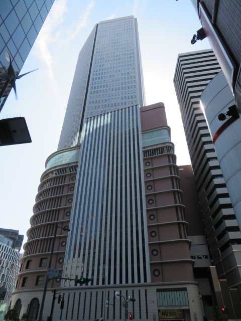 阪急百貨店の上にあるということで、下から見ると、阪急の茶色の建物と重なっているのがよくわかります。茶屋町の方から入っていくと、入り口がわかりやすいです。上に行くのは無料で、遮蔽物のない高層ビルの景色が楽しめます。