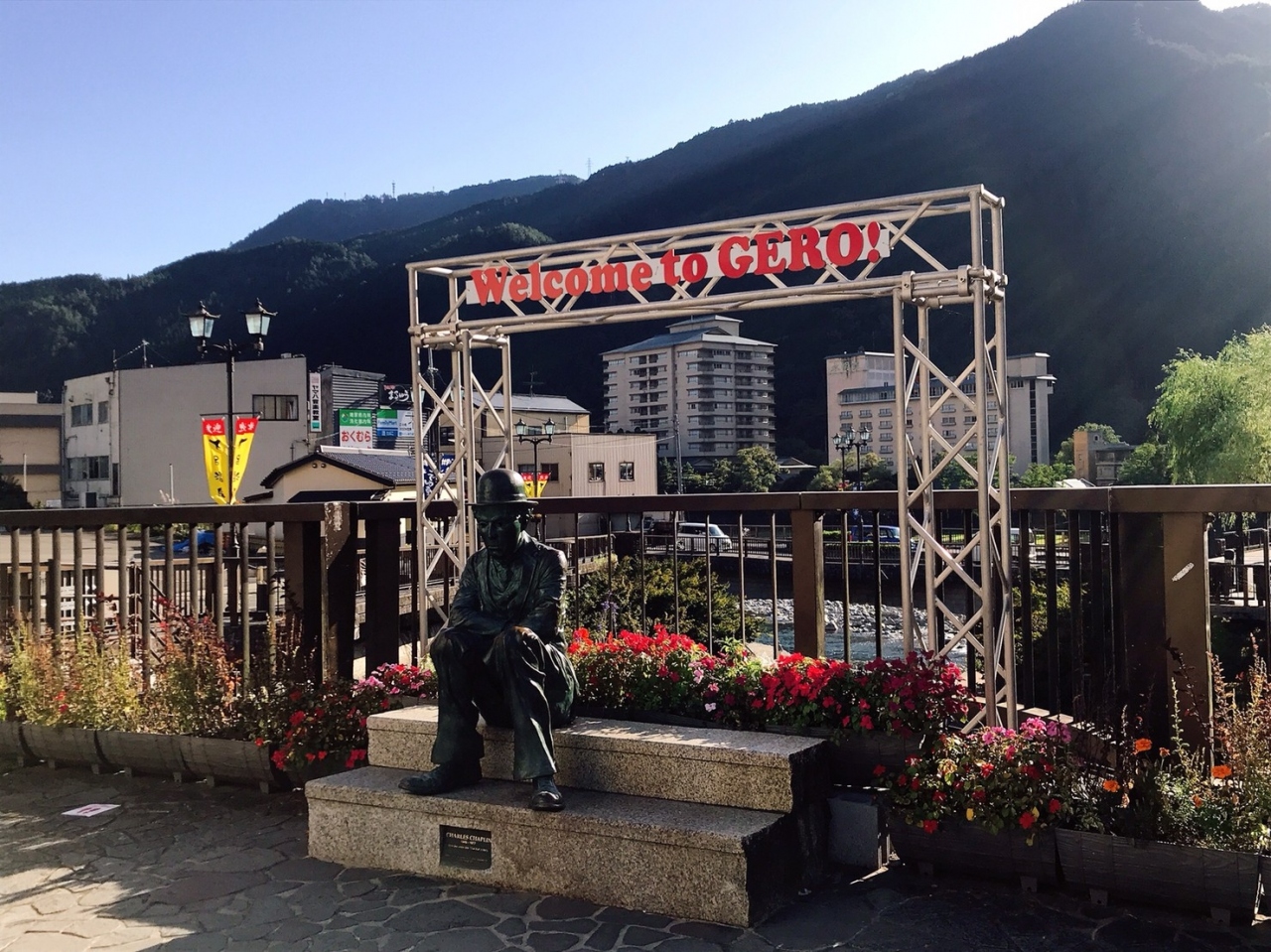 近くには有料駐車場しか無いので、下呂市営駐車場に停めました。温泉街の中心の白鷺橋にあるので、周辺の観光スポットの散策途中に見れます。なぜ下呂にチャップリン?と思いましたが、記念撮影スポットにもなっていました。
