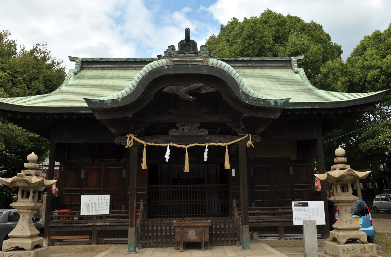 この地に刀匠が集まっていたことをうかがわせる神社だ。祭神の天目一箇神は山陰地方の製鉄場、各地の刀の産地でよく見かける神様で、まさに鍛冶そのものだ。が、小烏大神はあまりよくわからない。ただ、表の鳥居から入ると神社で、裏の鳥居から入ると小烏大明神、また境内にはお稲荷さんも勧請されており、この地に集まった多くの刀匠の信仰心を満たす存在だったことがうかがえるようだ。足利尊氏ゆかりの古戦場でもある。