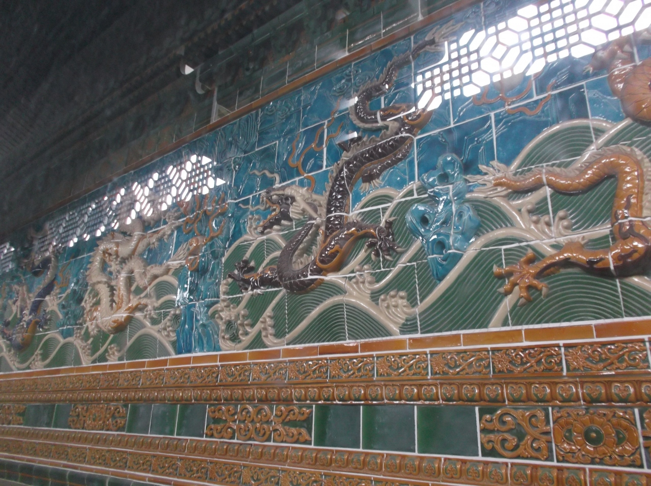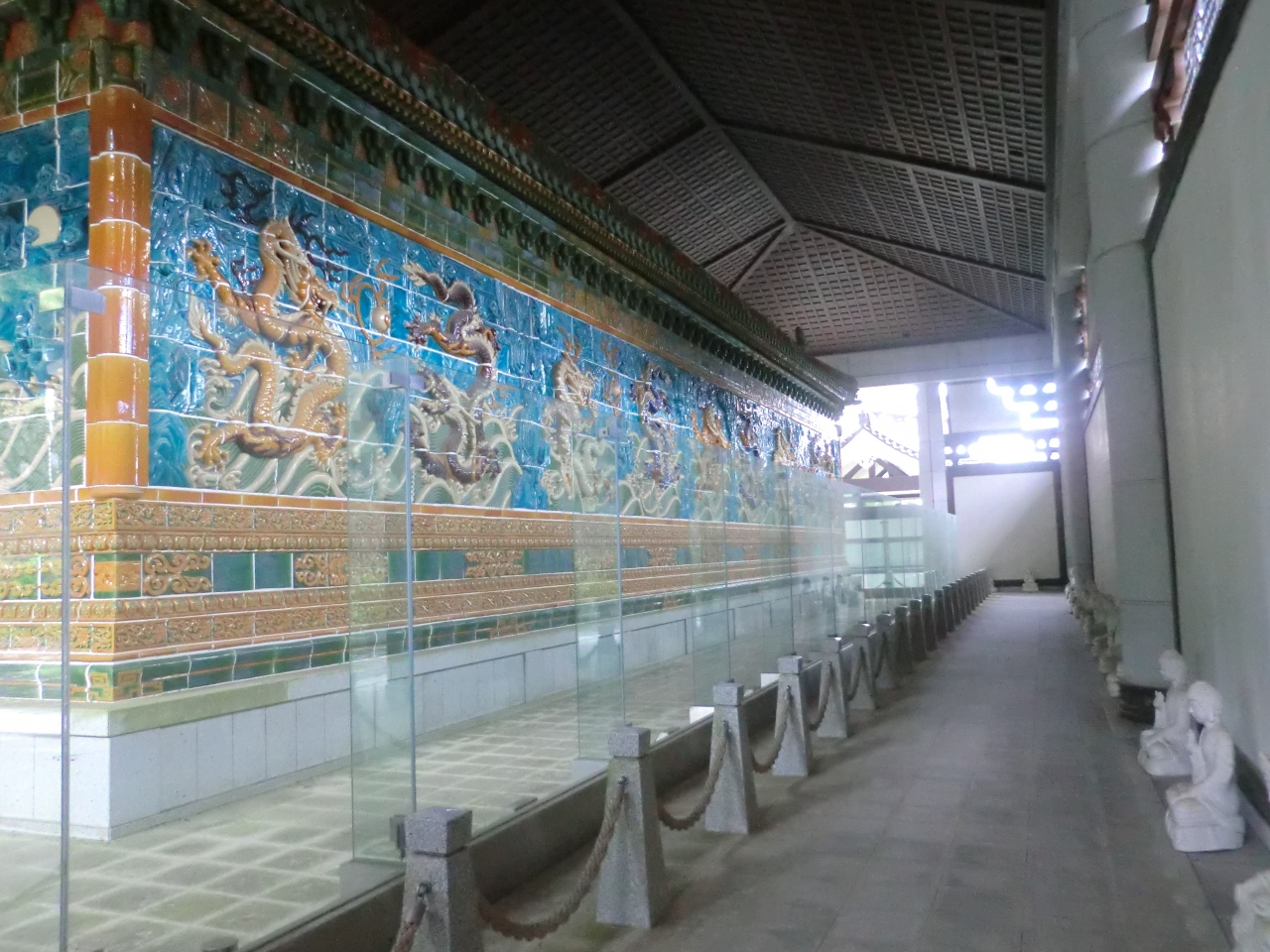 五重の塔の近くにありました。この中では大きくはありませんが建物中央の壁には龍の装飾壁がありました。この壁はいかにも中国のお寺風でした。北京の北海公園の国宝の壁を中国政府の許可により再現したものです。その周りには多くの石仏があり見ごたえがありました。