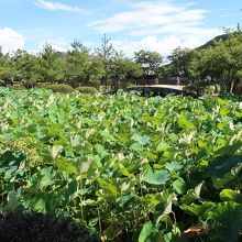 嵐電 嵐山駅に近い天龍寺の山門を入った先、駐車場になっている参道の脇に放生池があり、放生池には池一面にハスで埋まっています。初夏にはピンク色の大きなハスの花が見られるのですが、訪れた8月は花は終わっており、一面葉っぱだらけ。花を見に行くなら初夏の朝が良いでしょう。